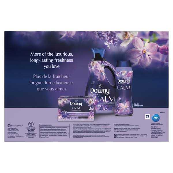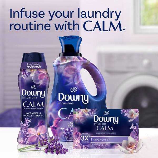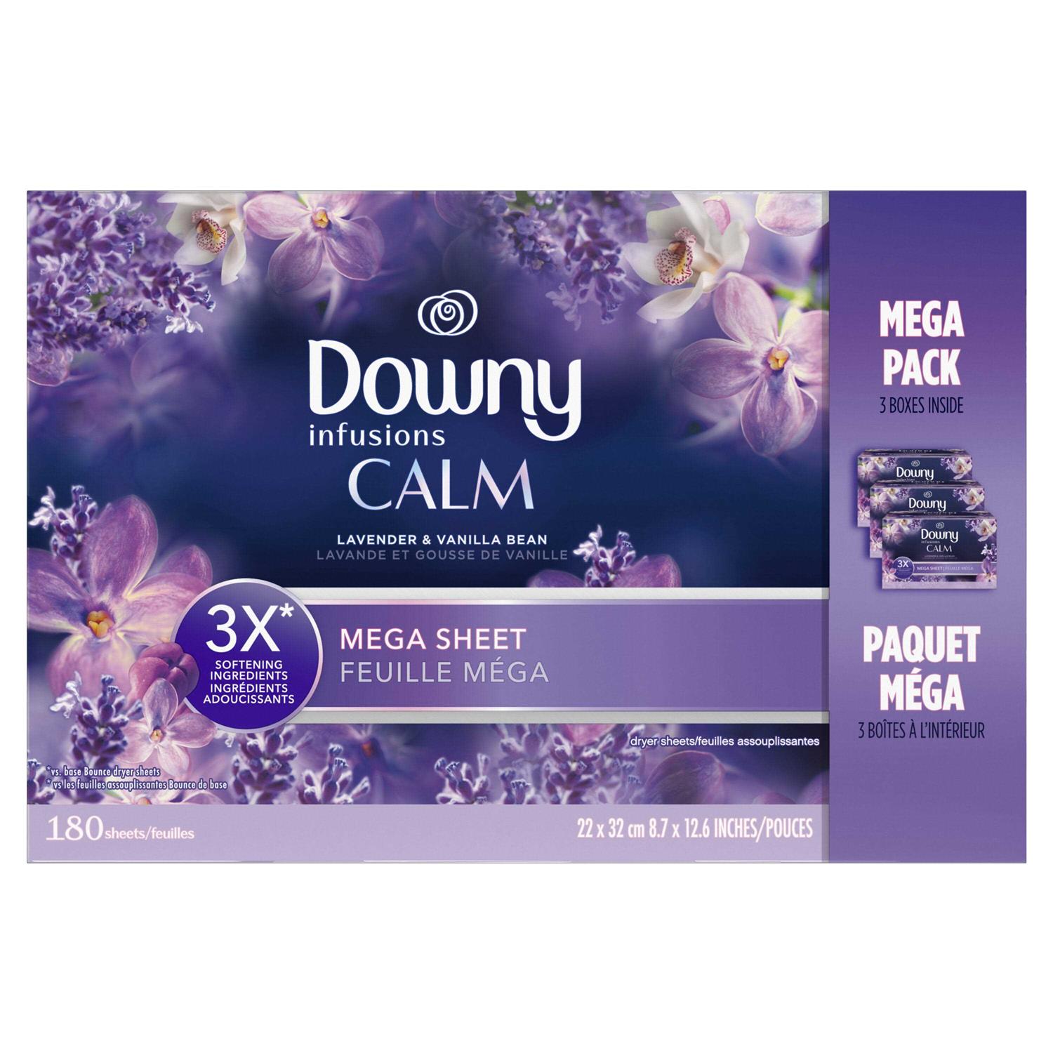Dryer Sheets by Downy. Details:Let the soothing scents of lavender and vanilla bean surround you with Downy Infusions CALM Mega Dryer Sheets. Downy Mega Sheets provide 3X softening ingredients* to leave your clothes fantastically soft and fresh, making it the perfect finishing touch for your laundry routine. Enjoy less static and fewer wrinkles and more of the calming scent you love. Toss one sheet in your dryer and experience long-lasting freshness and softness. Infuse your laundry routine with more calming scents with Downy Infusions Liquid Fabric Softener and Downy Infusions In-Wash Scent Booster Beads. *Vs.