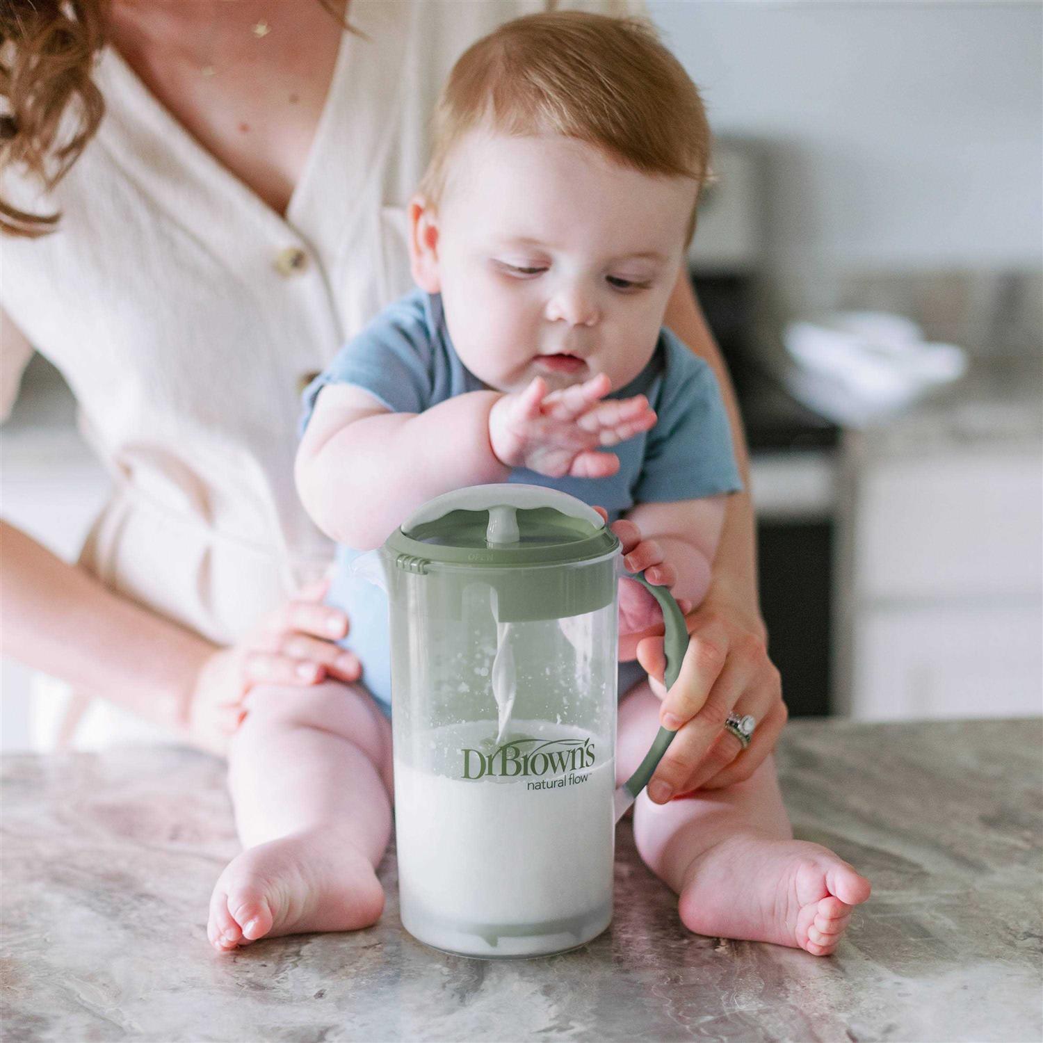 Formula Dispensers & Mixers by Dr. Details:Dr. Brown’s Formula Mixing Pitcher offers fuss-free formula preparation for up to four (4) 8oz/250mL baby bottles at once. The mixing pitcher’s unique blade quickly dissolves and blends up to 32 ounces of formula with no leftover clumping. An adjustable stopper keeps the mixing blade from lifting above the liquid, reducing the amount of air that enters baby’s formula to help minimize air-swallowing during feeding and reduce gas. Available in several stylish colors including Teal, Blue, Olive, Orange and Black. The spill-free locking lid and no-drip spout offer easy and convenient pouring. The Formula Mixing Pitcher is easy to disassemble and dishwasher safe (top rack only).
