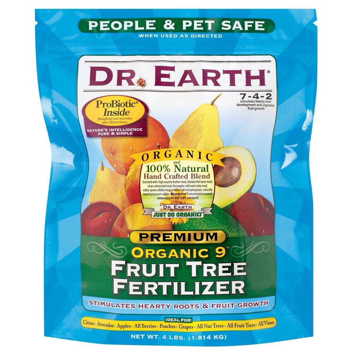 Dr Earth Organic 9 Fruit Tree Fertilizer combines Pro-Biotic 7 champion strains of beneficial soil microbes plus 8 strains of Endo and Ecto Mycorrhize. It also contains a blend of cottonseed meal, soft rock phosphate, alfalfa and kelp meal, seaweed extract, mined potassium sulfate, and feather meal. Can be used to feed citrus, fruit trees, plums, all berries, almonds, all fruit vines, persimmons, all vines, apples, avocados, apricots, peaches, all nut trees, grapes, and potted plants. Organic 9 produces incredible results because the contained nutrients are released quickly, but will also continue to feed for several months after. Stimulate hearty root development and more abundant sets.