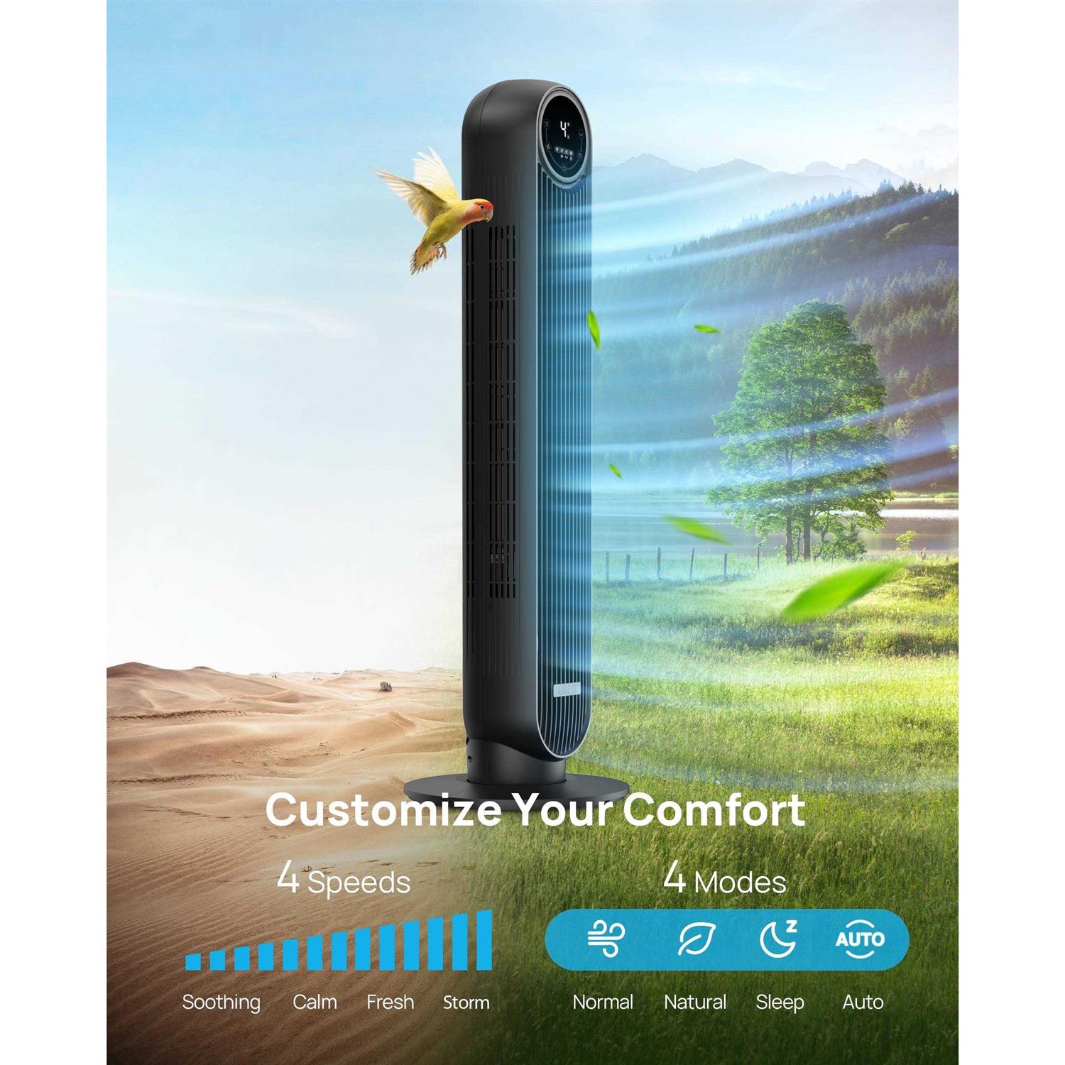 Dreo 36” Portable Oscillating Tower Fan Introducing Dreo’s most compact and powerful tower fan yet This fan comes with a removable rear grille that makes for easy cleaning and includes a wide range of features to personalize your comfort during sweltering hot days. Powerful Meets Portable Dreo’s all-in-one airflow system combines with a supercharged electric motor, delivering high-speed, brisk cool. This 36-inch compact tower fans blow cold air, enlivens every inch of air in your living space fast at up to 24ft/s. Cut Out the Noise Quiet Like a Whisper. The Bzier curve and Coanda effect reduce the running noise of this floor fan for the bedroom down to 35dB. With display auto-off, auto mute, 8h timer, and soothing airflow, this fan makes sure you have a restful sleep all night. Far and Vast 90-degree oscillation and calibrated airflow path allow this oscillating fan to cover more areas in the room. Combine with your AC unit to cut cooling costs during hot days. Customizable Comfort Featured with 4 modes (Normal/Natural/Sleep/Auto) and 4 speeds from soothing-soft to storm-soft, you can easily customize your comfort at the touch of a button, on the panel, or the remote. Easy to Clean & Safe to Use A removable rear grille makes cleaning more accessible. Designed with fingertip pinch-proof grilles, a fused plug, and built-in circuit protection, this ETL-listed tower fan ensures safety is always prioritized. Fit Anywhere With a compact design and a hidden handle, you can easily store the remote in the built-in compartment and carry this standing fan to your bedroom, living room, or elsewhere. A perfect choice for home and office.