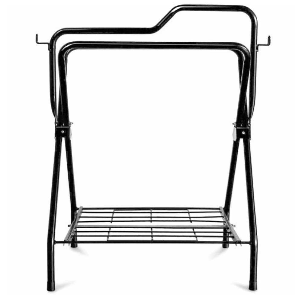 34-2/3 in. x 30-1/2 in. Steel frame Black powder coated Freestanding rack folds up for portability and storage, and features 2 tack hooks and heavy-duty blanket storage platform. Max. 75lbs loading capacity.