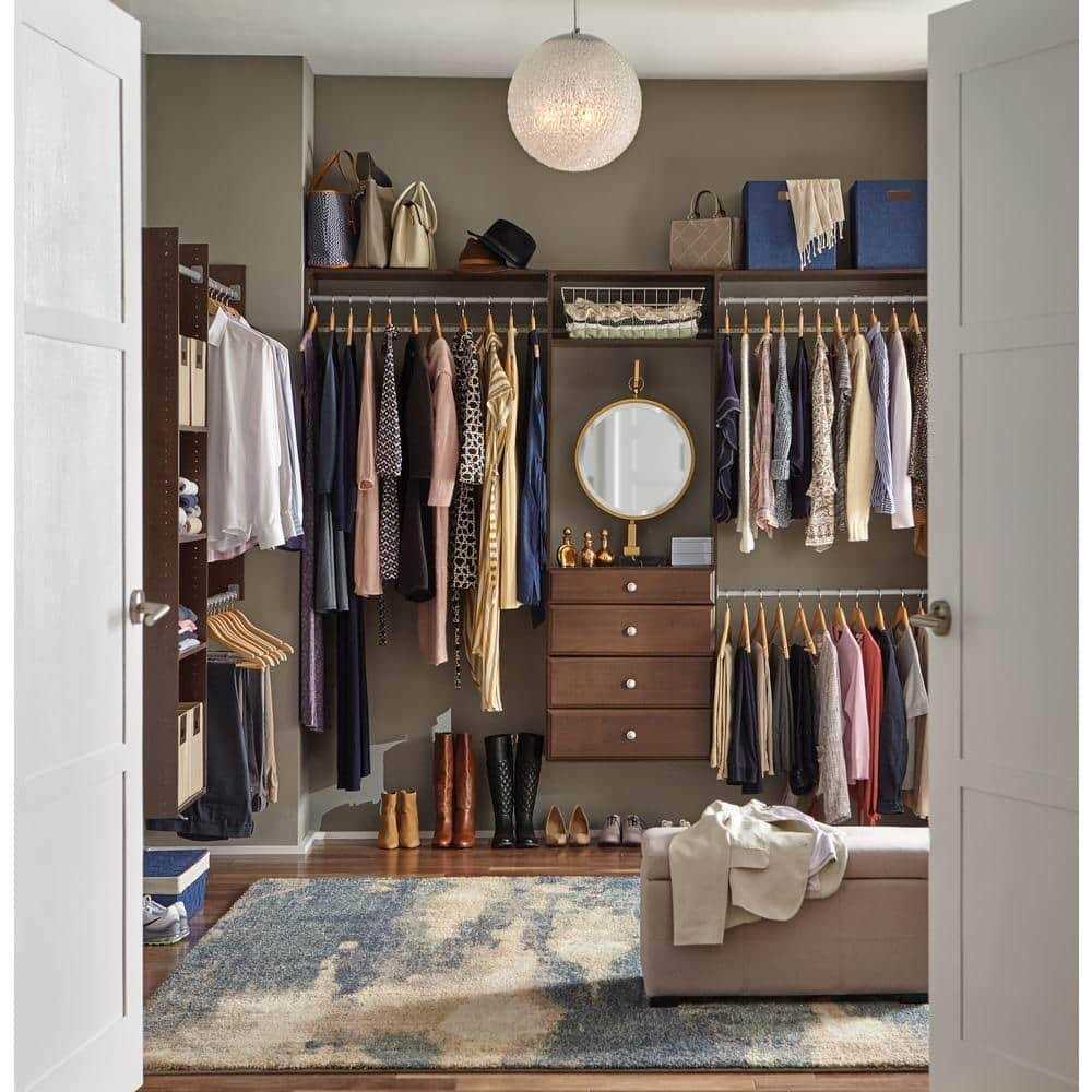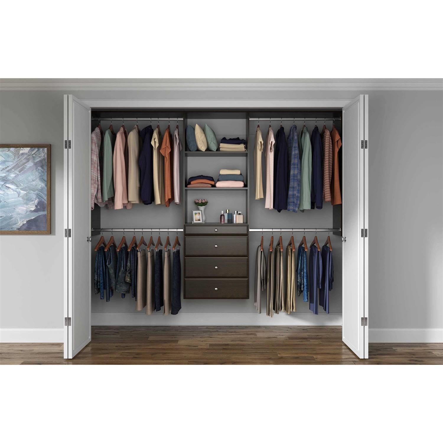 Closet storage tower system hangs on a steel track and mounts to the wall for a convenient set-up. Includes 4 drawers, 6 shelves, and 4 rods to store all of your clothing, shoes, and other personal items. Wooden closet system features 1 4-inch drawer and 3 8-inch drawers with full-extension that all easily glide with full-extension for easy access. Coated with durable and thermally-fused laminate for long-lasting use and beauty. Kit includes all necessary hardware for an easy installation process.