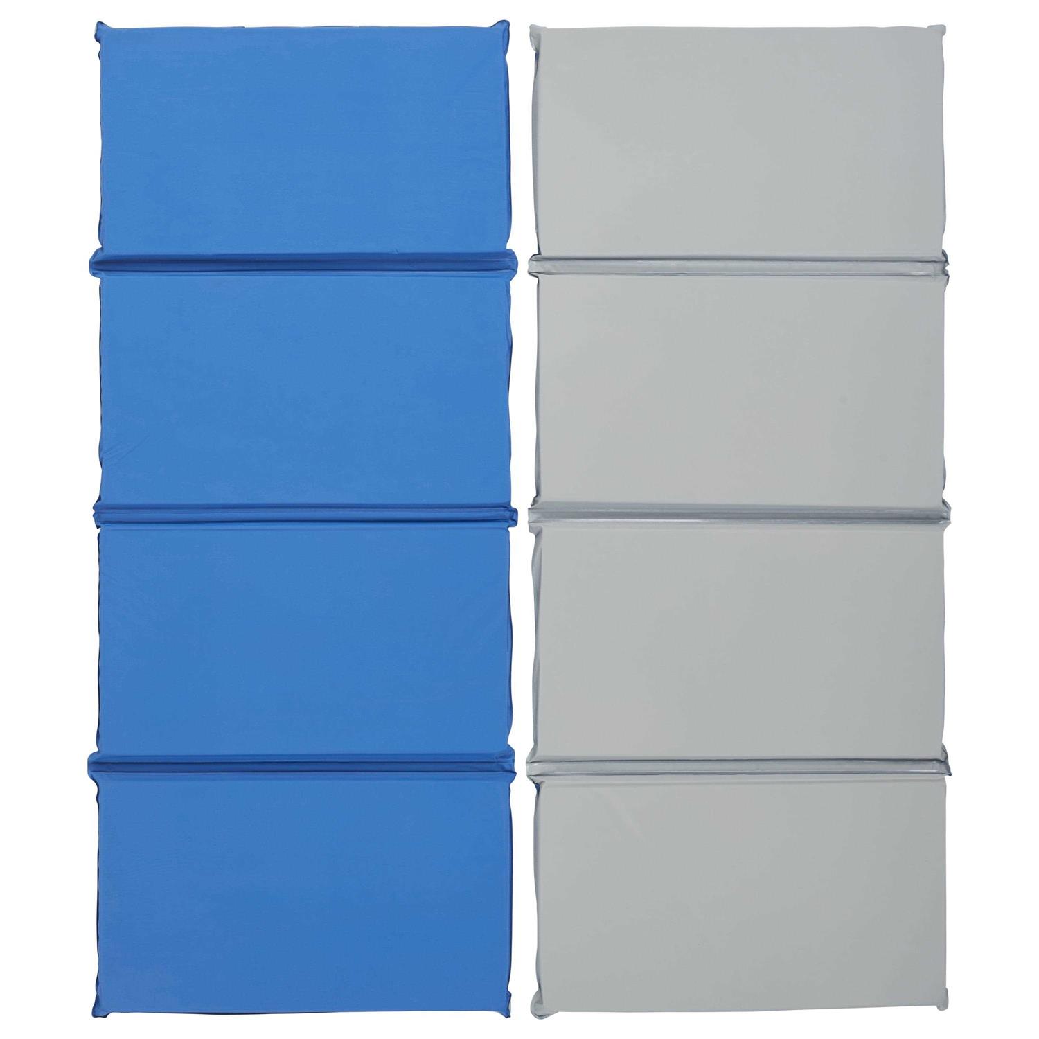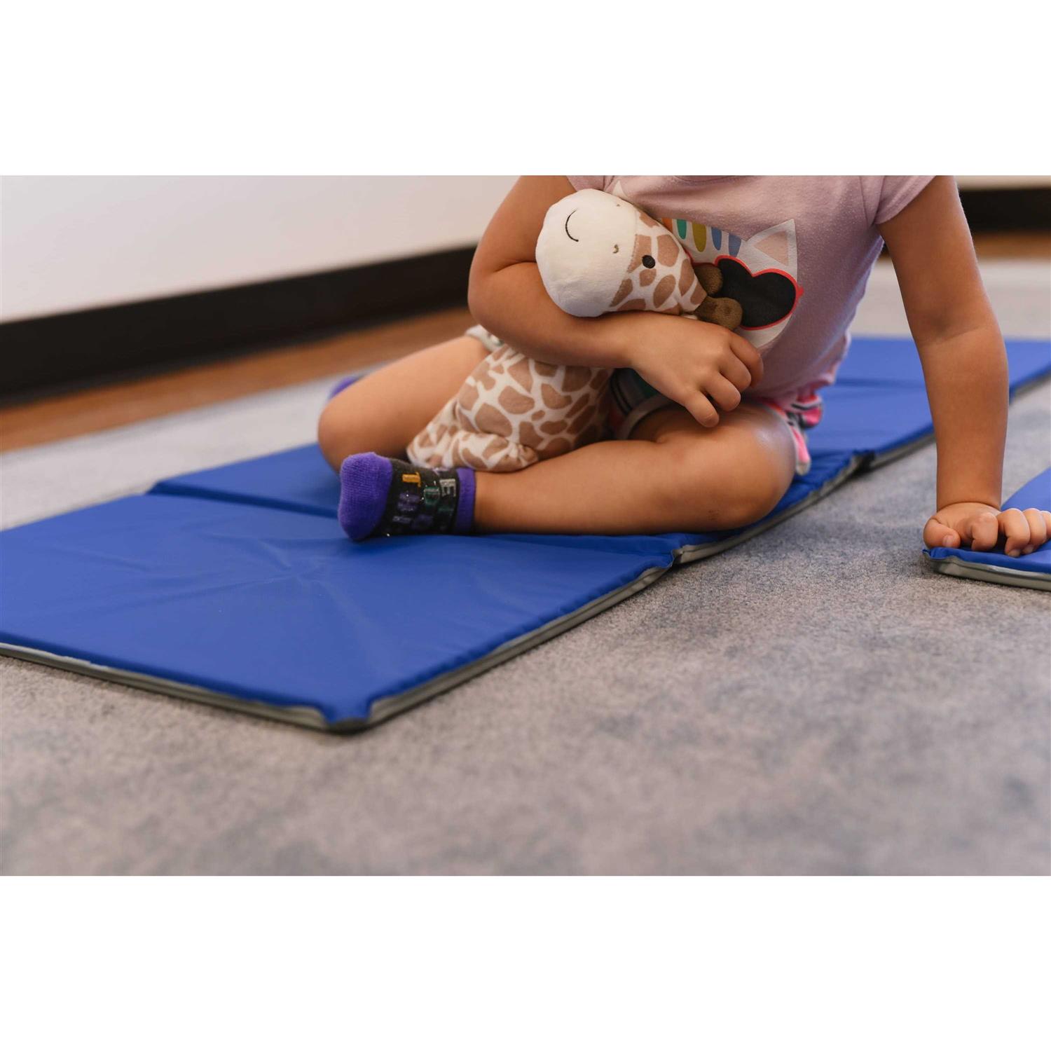 Sleepy-Time Value Rest Mat is a low-cost rest time solution for preschool age children with superior features and functionality. This 4-section mat has a 1-inch dense foam core covered in a radio-frequency heat-sealed vinyl to keep liquid out and prevent bacteria growth. The 8 mil water-resistant vinyl covering is 30% thicker than the competition which helps to resist tears and makes mats easy to clean. Maintain sanitary conditions with the dual-colored gray/blue mats by placing the blue side on the floor and the gray side for sleeping. Easy to disinfect, simply wipe with a solution of 1/4 cup of household bleach diluted in 1 gallon of water, then thoroughly rinse with a clean wet cloth. Rest mats meet California TB117 flammability requirements and are GREENGUARD GOLD Certified for reducing chemical pollutants and helping improve the quality of indoor air. Mat folds to measure 19 W x 11 L x 4 H inches for space saving storage when not in use. Unfolded, the mat measures 19 W x 45 L x 1 H inches.
