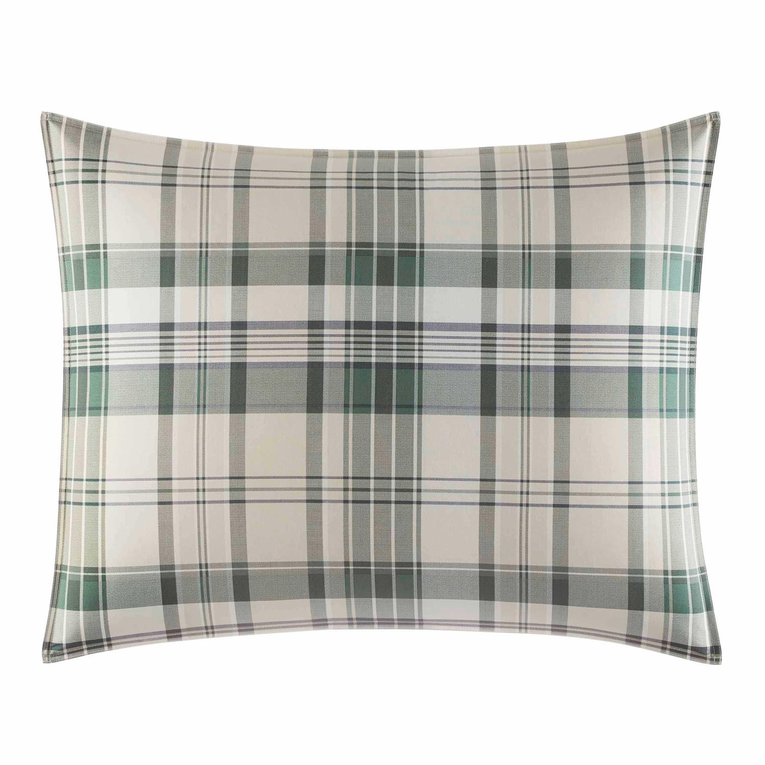 A boldly scaled plaid in shades of forest green and pale khaki on white creates a warm and welcoming atmosphere as soon as you walk into the room. Reminiscent of your favorite weekend wear, this handsome plaid and shirting stripe reverse will help you relax and unwind after a long day of work or play as you get comfortable in its soft cotton embrace. Double needle stitched edging on the duvet cover and shams makes a clean, tailored finish. Layer in our herringbone blanket in evergreen for additional warmth and a pop of color and add our camp out cotton print sheet set for a whimsical note.