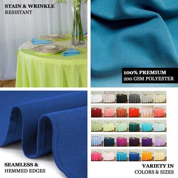 With our sturdy, economical and high standard material polyester tablecloths can withstand any heavyduty events and extensive reuse, our durable polyester tablecloth is an ideal choice to enhance the elegance of your party and banquet tables. From the extensive array of colors, you can pick the perfect hue to coordinate with your party theme color.