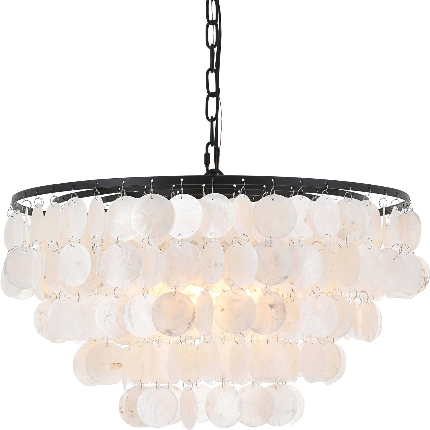 The gentleness of the Selene collection pendant lamp in a black finish elicits the calm temperament of the moon and the coy– yet soothing light it emits. Weaving through the myriad of the draped shell curtains the illumination creates a new design every time whether it is the shadows and highlights that changes with the direction of the light just as the moon goes through its phases or the shadows casted with every slight movement of the white shells. A wonderful addition to any home–foyer living room or a child’s room.
