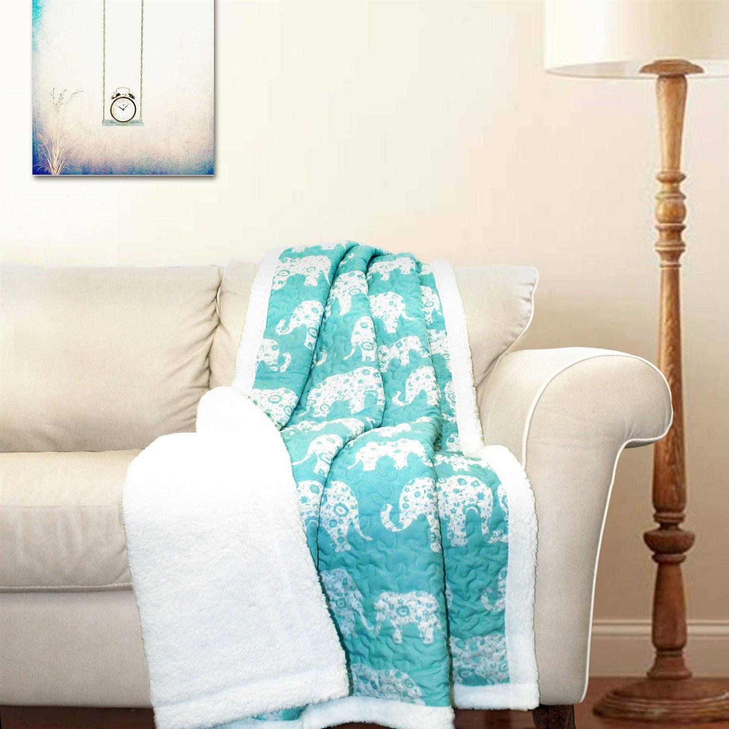 Add some color and whimsy to your linen supply with this Elephant Throw Blanket. It reverses to a plush and comfy sherpa material that is oh so cozy. On a chilly evening, you can stay warm and comfortable with this elephant blanket for adults. It has a parade of white spotted elephants throughout that makes it an eye-catcher. This elephant sherpa throw blanket will add an ideal finishing touch to your living room, den, bedroom or guest room. You can cozy up with it while reading, watching the game or your favorite television show. The sherpa Lush Decor throw blanket is also ideal for car rides, sitting on benches during sports games and drive-in movie theaters. It is made of high-quality microfiber material with a 100 percent polyester fill for optimal comfort. The fabric is machine washable for easy care. This reversible throw is available in assorted colors to help complement your interior decor and personal style.