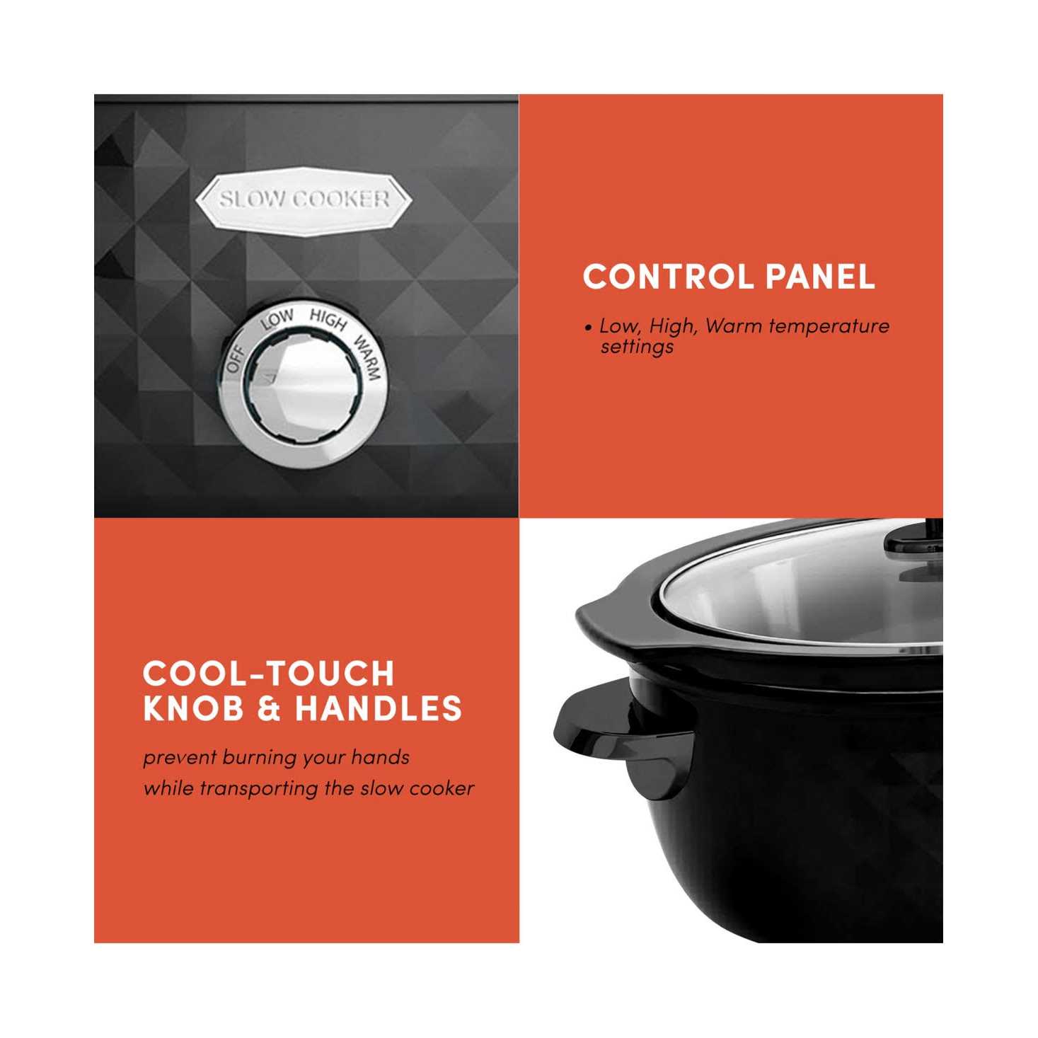Get creative making healthy, home-cooked meals with the elegant easy-to-use Elite Gourmet 6 quart Diamond Pattern Slow Cooker. It features convenient low, high and keep- warm settings. The beautiful black diamond pattern body houses a 6 quart oval removable stoneware pot that nicely accommodates anything from soups, stew, grandma’s pot roast, soups, casseroles, curries, chili and more. The perfectly-sized 6 quart stoneware pot is big so you can slow cook those large cuts of meat ensuring there is always enough to go around. The Elite Gourmet 6 quart Diamond Pattern Slow Cooker delivers consistent, even heat, while its tempered-glass lid traps in moisture & nutrients for delicious results and allows easy viewing of the cooking cycle. Attractively housed in a stylish black diamond pattern housing with black accents, it is a great addition to any kitchen.