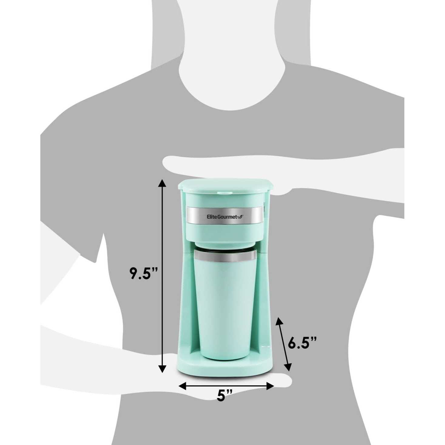 The Elite Gourmet Personal Coffee Maker with Stainless Steel Travel Mug features a compact and sleek design that takes up limited counter space and stores easily. Perfect for small spaces such as office kitchens, dorm rooms or recreational vehicles. Quickly and effortlessly brew your favorite coffee blend to jump start your day. The coffee maker also includes a 14 oz stainless steel interior travel mug that fit directly under the dispenser so fresh coffee is always ready for you to enjoy. No need to stop at a local coffee house to buy a cup of joe just to make it through the day. Cleanup is a cinch, all removable parts and accessories are dishwasher safe. Enjoy a cup of fresh coffee in the comfort of home with the Elite Gourmet Personal Coffee Maker!
