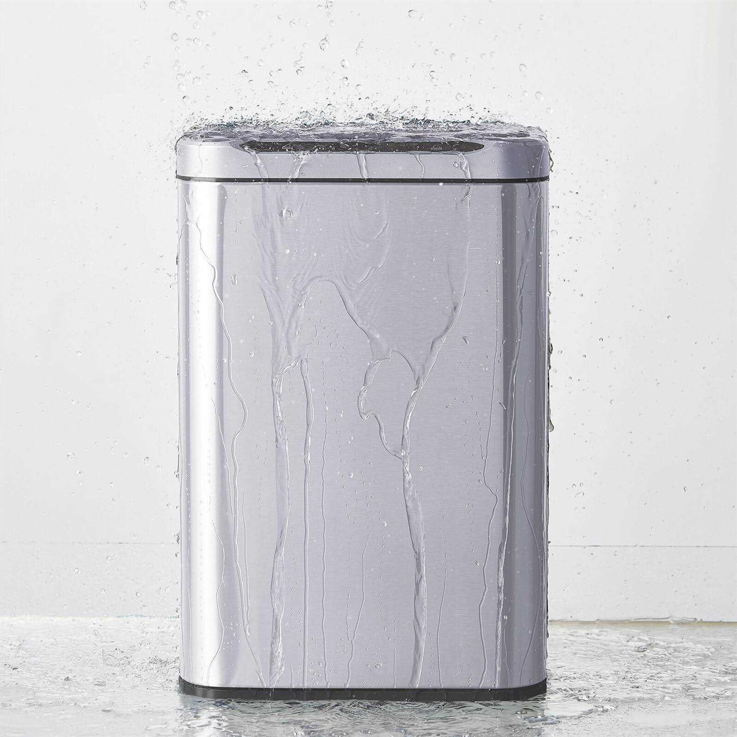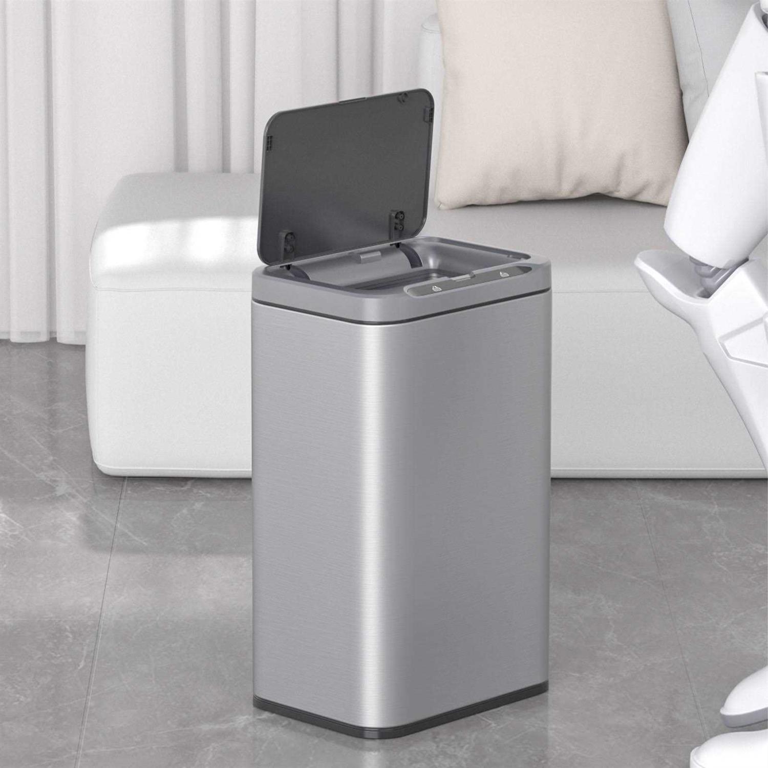 The dimension of it is 11”L×8”W×18.1”H. SMART SENSOR:This trash can is equipped with an infrared sensor and requires 3 AA batteries (not included). When you bring your trash or any part of your body near the sensor, the lid will respond quickly and open automatically within 0.3 seconds. FIXING RING: The fixing ring prevents the garbage bag from running around and fixes it in the right place, and also can hide the garbage bag well to make the garbage can more beautiful. Such a design without inner bucket can also allow greater inner capacity with smaller external dimensions. When you press the button on the right, the lid will descend smoothly. DISPLAY LIGHTS:There are 5 display lights. When you put the garbage or any part of the body in the sensing area, the bucket lid automatically opens and 5 blue display lights turn on. When leaving the sensing area, the blue light starts to read the seconds and the bucket lid closes in 5 seconds. DURABLE MATERIALS:The brushed stainless steel body makes our trash cans fingerprint-proof and durable.The sophisticated rectangular appearance also makes it suitable for a variety of occasions. NOISE AVOIDANCE – Silent and smooth close lid, reducing the noise generated during use. CUSTOM FIT GARBAGE BAGS – Our code C trash bags are designed to fit perfectly in this trash can so they don’t slip and are completely hidden. The extra thick plastic and double stitched construction prevents tears and breakage.