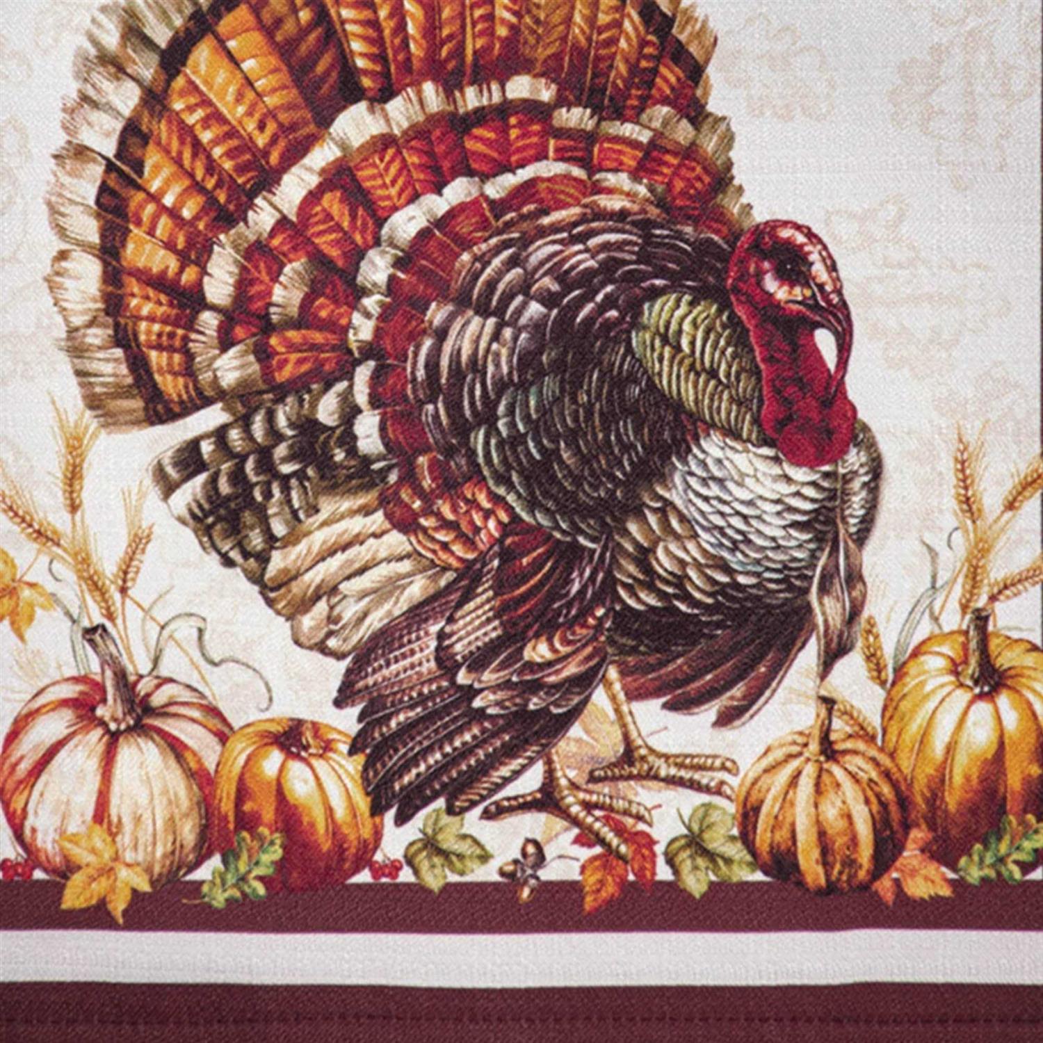 Dress your table to give thanks to the season with our Autumn Heritage Turkey Engineered Tablecloth. Inspired by the harvest, this elegant printed tablecloth features gourds, wheat, pumpkins, leaves and a distinguished turkey in a mix of golden fall colors over an ivory ground with a classic brown double border design. Excellent for Thanksgiving dinner, special occasions, events, parties, family gatherings and everyday use throughout the fall season. Soft and durable fabric can be ironed to release stubborn creases and keep your tablecloth wrinkle free. Hemmed edges add a finished look and prevent wear and tear. Available in a large selection of table shapes and sizes including square, rectangle, oval and round, you are sure to find the perfect fit for all of your entertaining needs. 100percent Polyester. Easy care, machine washable. Coordinate to the Autumn Heritage Turkey Engineered napkins, placemats and table runner to complete the look.