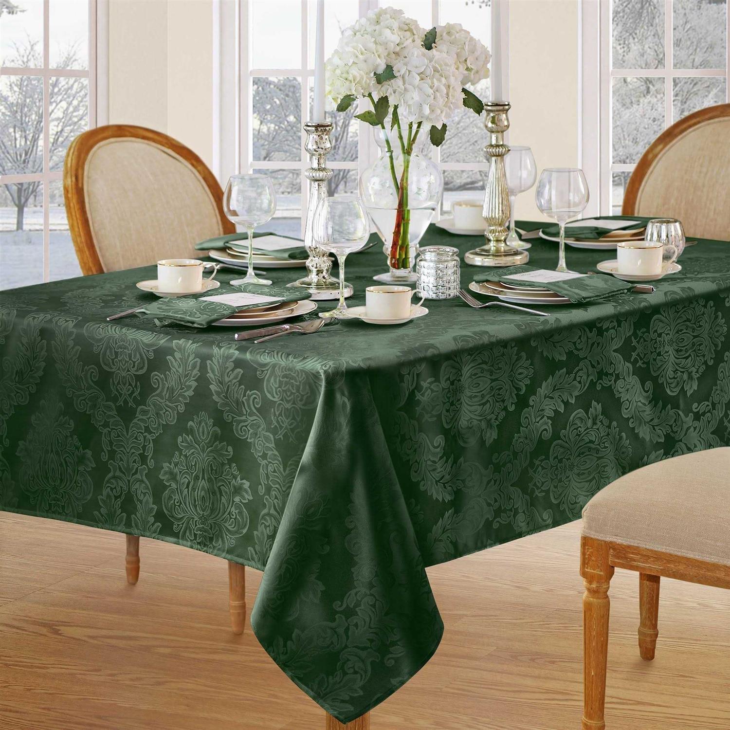 The Barcelona Jacquard Damask tablecloth is the perfect solution to your decorating and table linen needs. Delicately woven jacquard damask design gives it the versatility of a solid, with a touch of fashion. Excellent for special occasions, events, parties, family gatherings and everyday use this table cloth has the soft hand of an ordinary tablecloth, with the added function you need. Fabric features water and stain repellant finish. Silky fabric can be ironed to release stubborn creases and make your tablecloth wrinkle free. Hemmed edge adds a finished look and prevents wear and tear. Available in a large selection of table shapes and sizes to fit all your entertaining needs. 100percent Polyester. Easy care, machine washable.