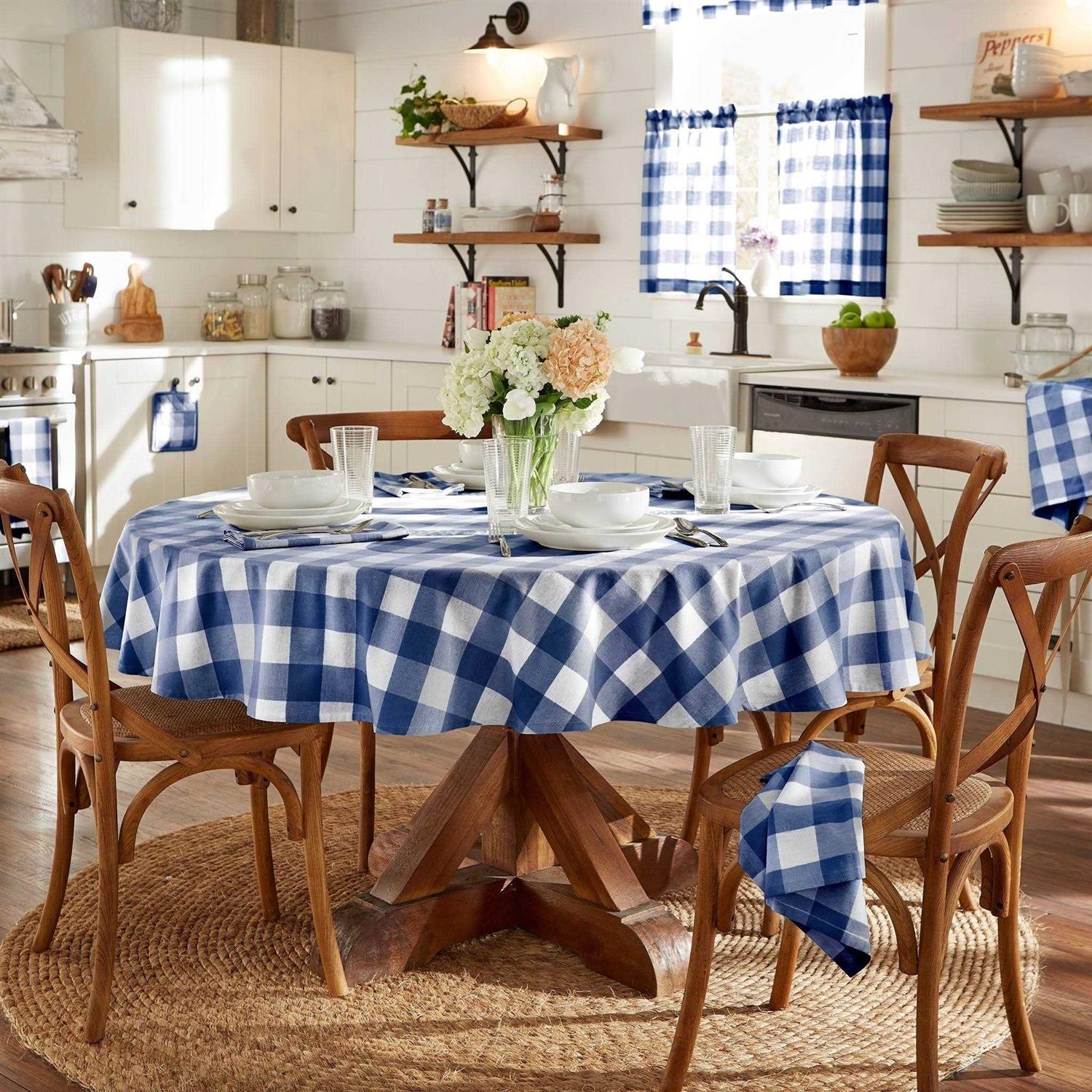 Stylish, rustic and beautiful the Farmhouse Living Collection offers everything you need to create the shabby chic, modern country home. This fashionable tablecloth is made from premium quality cotton and features the perfect buffalo check pattern in a variety of colors to create the best Farm house look. Excellent for special occasions, events, parties, and everyday dcor use. Soft cotton can be easily ironed to release stubborn creases and make your tablecloth wrinkle free. Delicately hemmed edge adds a finished look and prevents wear and tear. Available in several sizes and shapes including rectangle, square, oval and round. Coordinate to all the items in our Farmhouse Living collection including napkins, placemats, pot holders, kitchen towels, kitchen mats and window treatments. 100% cotton. Easy care, machine washable.