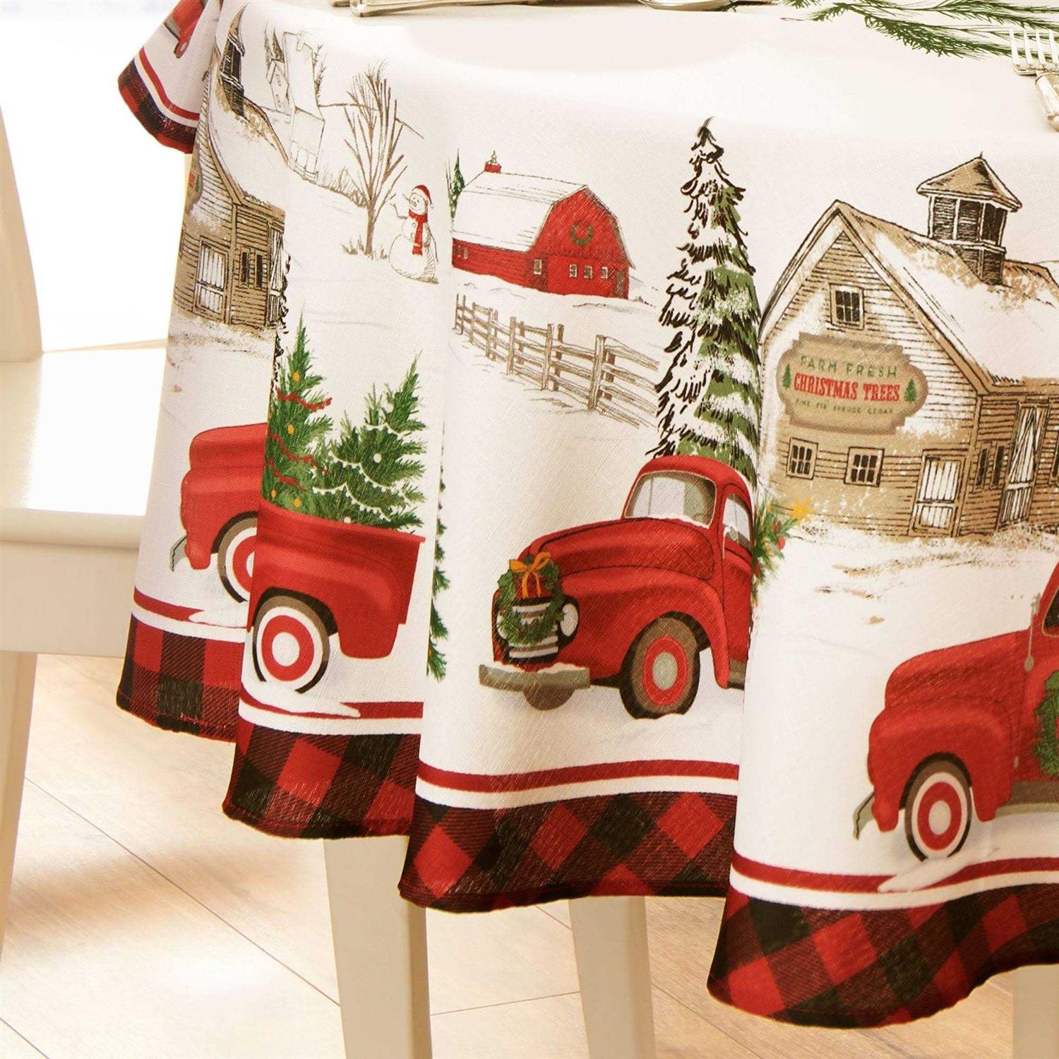 The Vintage Christmas Tree Farm printed tablecloth brings a festive, nostalgic look to your table setting throughout the Christmas and Holiday season. Holiday inspired, decorated with snowmen, evergreen pine trees, a classic red pickup truck and a vintage Christmas tree barn. Features a soft white ground and a red and black buffalo check border design for a rustic farmhouse look. Excellent for special occasions, events, parties, family gatherings and everyday use during the holiday season. Soft and durable fabric can be ironed to release stubborn creases and make your tablecloth wrinkle free. Hemmed edge adds a finished look and prevents wear and tear. Available in a large selection of table shapes and sizes including square, rectangle and round to fit all your entertaining needs. 100% Polyester. Easy care, machine washable. Coordinate to Vintage Christmas Tree Farm napkins, placemats and table runner to complete the look.