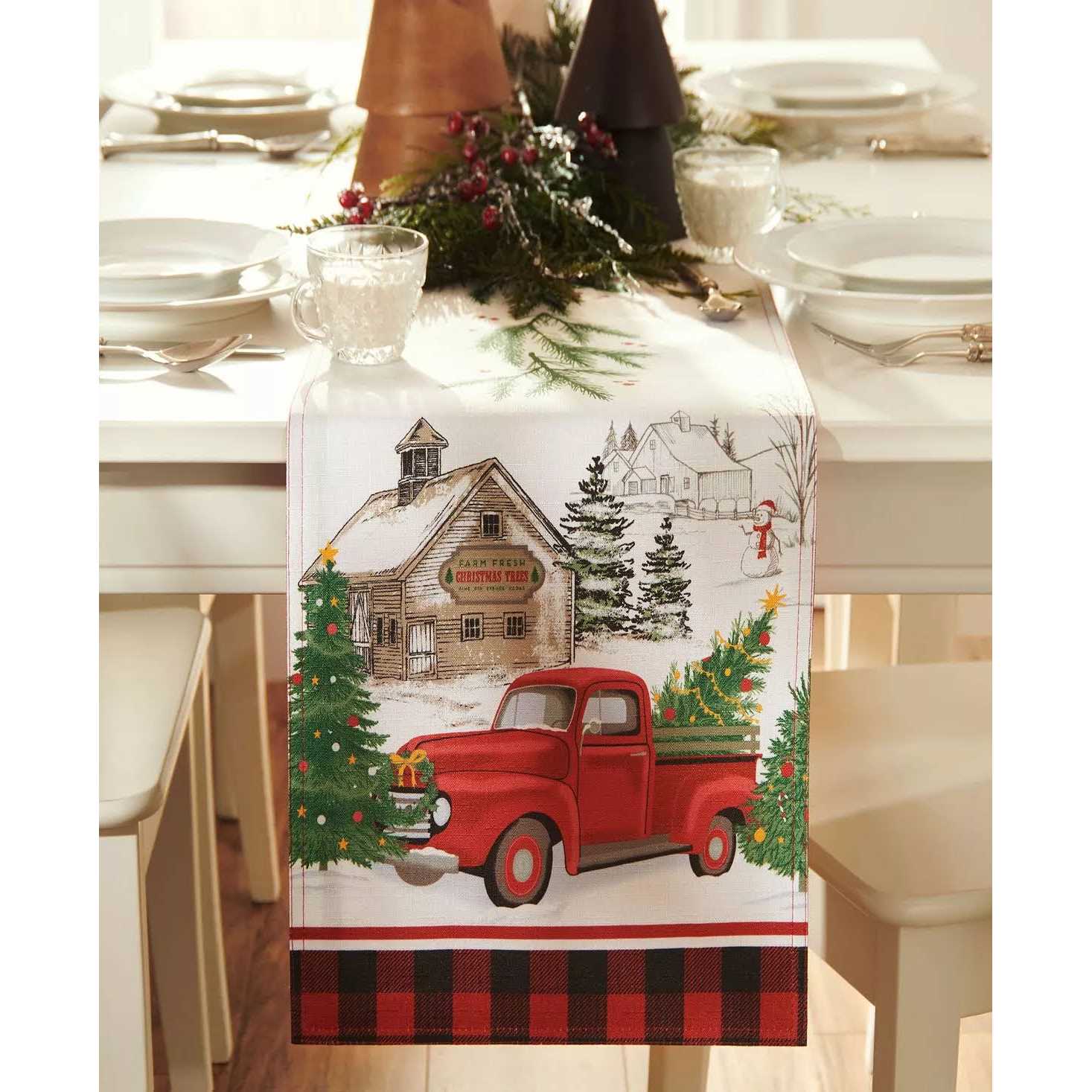 The Vintage Christmas Tree Farm printed tablecloth brings a festive, nostalgic look to your table setting throughout the Christmas and Holiday season. Holiday inspired, decorated with snowmen, evergreen pine trees, a classic red pickup truck and a vintage Christmas tree barn. Features a soft white ground and a red and black buffalo check border design for a rustic farmhouse look. Excellent for special occasions, events, parties, family gatherings and everyday use during the holiday season. Soft and durable fabric can be ironed to release stubborn creases and make your tablecloth wrinkle free. Hemmed edge adds a finished look and prevents wear and tear. Available in a large selection of table shapes and sizes including square, rectangle and round to fit all your entertaining needs. 100percent Polyester. Easy care, machine washable. Coordinate to Vintage Christmas Tree Farm napkins, placemats and table runner to complete the look. Size: 60″ x 102″. Color: One Color.