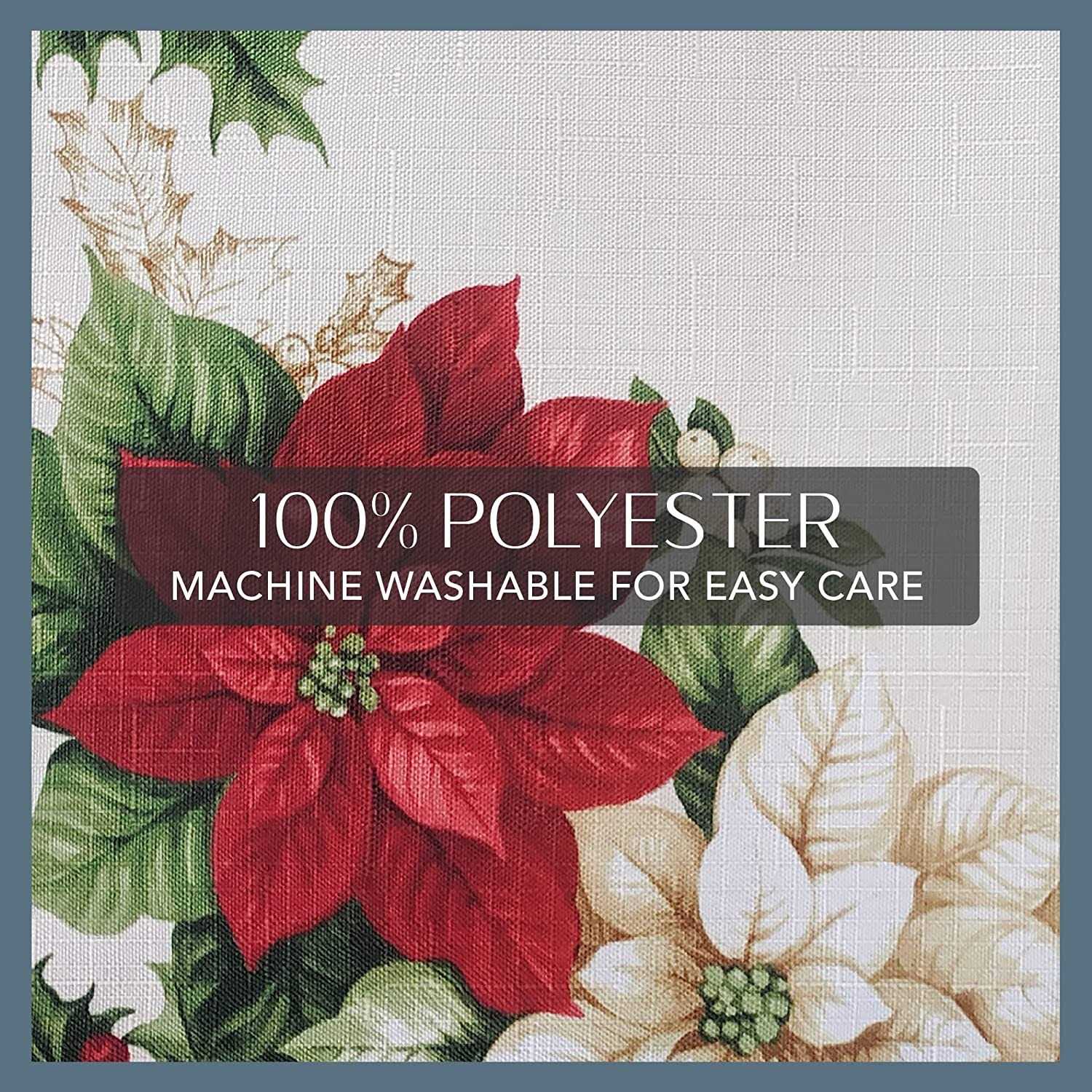 The Red and White Poinsettias tablecloth is the perfect solution to your seasonal decorating needs. Double border holiday design features vibrant red and white poinsettias with golden touches and green leaves and berries. Excellent for special occasions, events, parties, family gatherings and everyday use during the holiday season. Soft and durable fabric can be ironed to release stubborn creases and make your tablecloth wrinkle free. Hemmed edge adds a finished look and prevents wear and tear. Available in a large selection of table shapes and sizes including rectangle and round to fit all your entertaining needs. Round is engineered for all-around print. 100% Polyester. Easy care, machine washable. Coordinate to Red and White Poinsettias bordered napkins and placemats to complete the look.