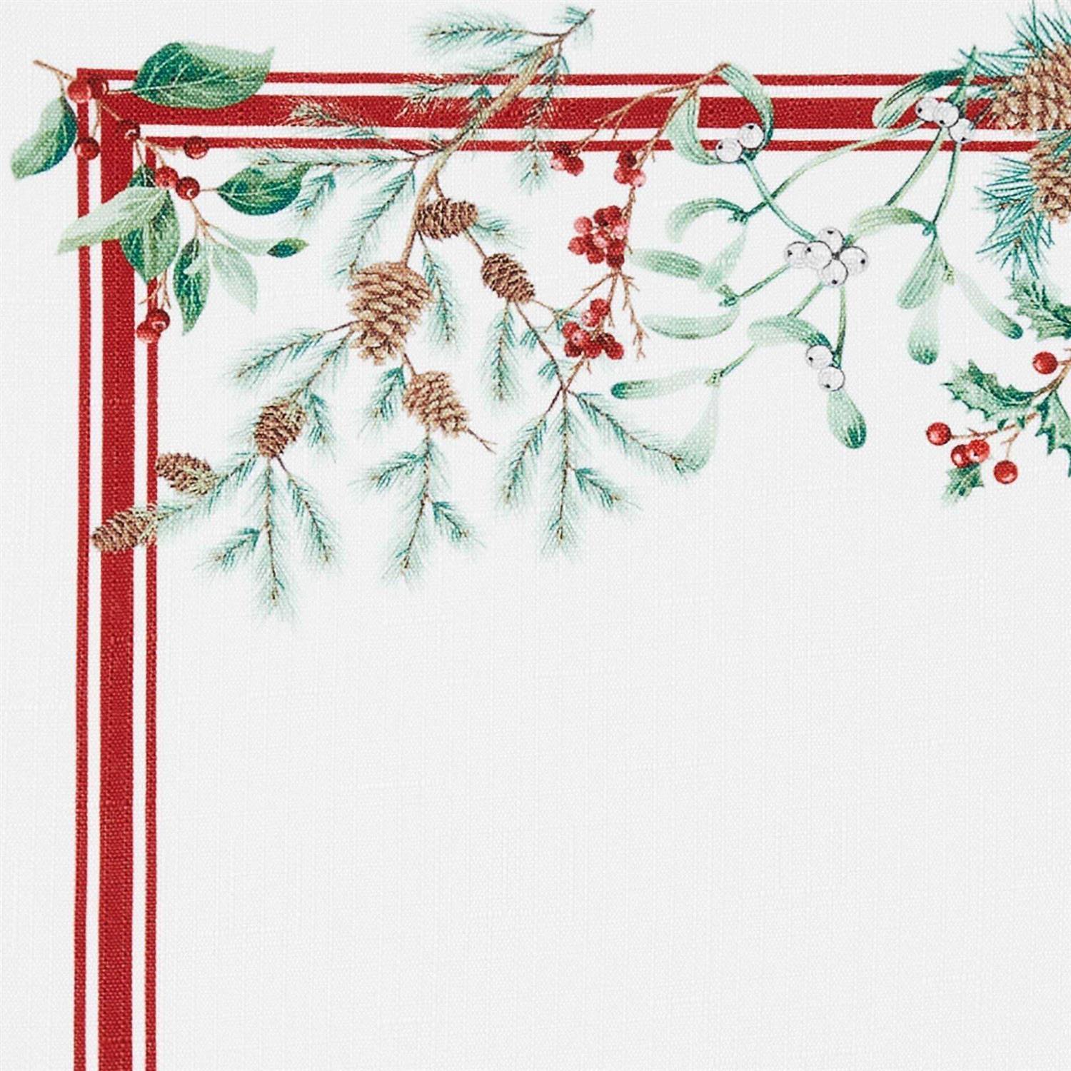 The Winter Holiday Berry printed tablecloth brings a transitional, elegant look to your table setting throughout the Christmas and holiday season. Inspired by nature, this tablecloth is decorated with green branches, pinecones, and winter berries. On soft white ground, it also features a classic red double bordered design. Excellent for special occasions, events, parties, family gatherings and everyday use during the winter months and holiday season. Soft and durable fabric can be ironed to release stubborn creases and make your tablecloth wrinkle free. Hemmed edge adds a finished look and prevents wear and tear. Available in a large selection of table shapes and sizes including rectangle, oval, and round to fit all your entertaining needs. 100percent Polyester. Easy care, machine washable. Coordinate to Winter Holiday Berry napkins, placemats, and table runner to complete the look. Size: 60×102 inches rectangular.