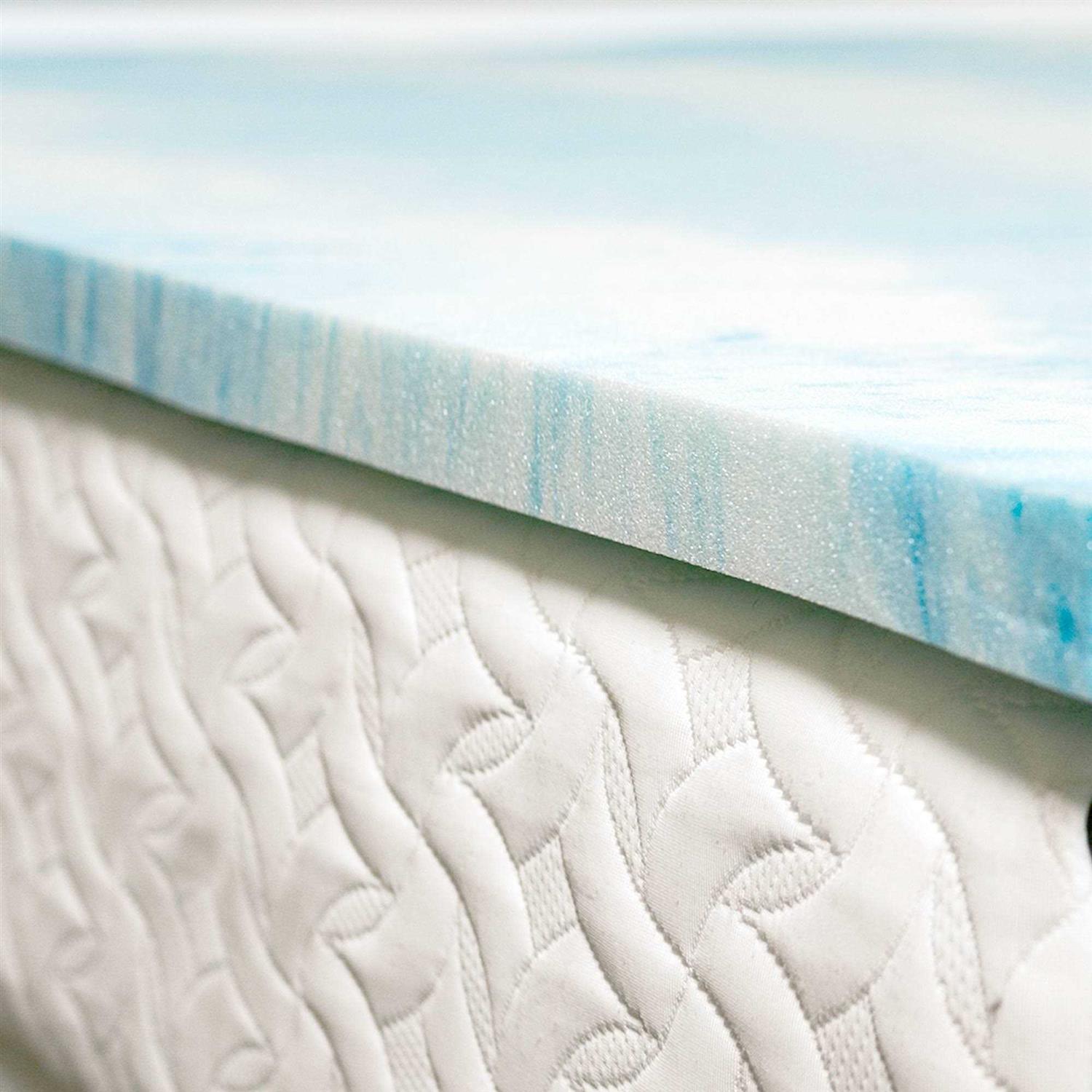 Give your mattress an instant upgrade with the soft and supportive 1.5 inch memory foam mattress topper. Marrying form and function, this accessory may be the answer you seek to a better night’s sleep. It helps by regulating your body’s temperature, preventing you from getting uncomfortably warm as you fall into a slumber. At the same time, layers of cushioned foam add a little extra height while comfortably embracing common pressure points, like your shoulders, back, and hips. Bid farewell to those morning aches and say hello to an entirely new sleep experience! The blue and cream swirl pattern adds to the topper’s appeal, lending it a fashionable finishing touch. Forget tossing, turning, and waking up at all hours of the night. With this practical addition to your bedding, you’ll sleep better– and will be a happier and more well-rested you, ready to face anything the day brings.