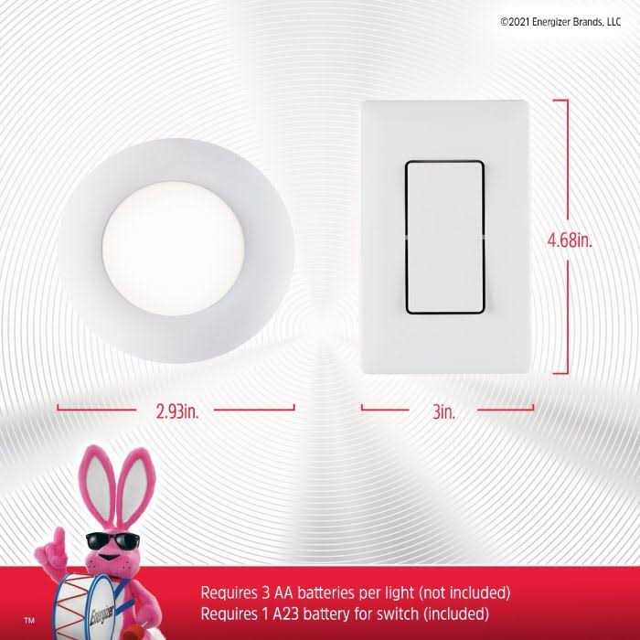 Light up a room and add instant convenience with the Energizer Wireless Switch LED Puck Light. It features high-quality LED technology that provides fantastic accent lighting for any location in your home or on the go. The light will automatically turn off after 60 minutes—perfect for saving battery life and giving you light only when you need it. The LED puck makes a great addition to spaces as varied as laundry rooms garages closets stairs basements RVs campers and much more. Control the light remotely using the wireless mountable wall switch. This eliminates the need for complicated in-wall wiring while providing convenient control from up to 50ft. away. Mounting hardware is included for easy installation in the area of your choice. Simply use the included double-sided tape or screws to mount the puck on any flat surface. Then install your 3 AA batteries and to power the light. For simple cost-effective and energy-efficient lighting choose the Energizer Wireless Switch LED Puck Light.