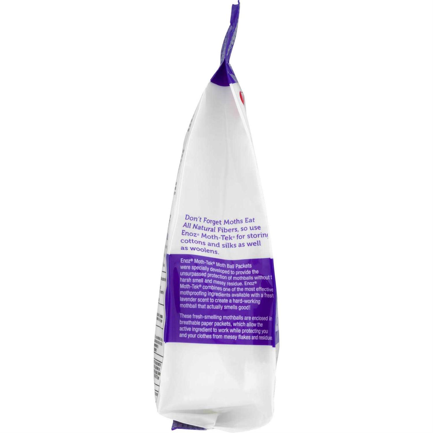 Since 1918. Kills clothes moths, carpet beetles and their eggs and larvae when used in air-tight containers. No clinging odor. Storage, garment bags, air-tight closets. This product can treat up to 18.75 cu. ft. Don’t forget moths eat all natural fibers, so use Enoz Moth-Tek for storing cottons and silks as well as woolens. Enoz Moth-Tek Moth Ball Packets were specially developed to provide the unsurpassed protection of mothballs without the harsh smell and messy residue. Enoz Moth-Tek combines one of the most effective mothproofing ingredients available with a fresh lavender scent to create a hard-working mothball that actually smells good! These fresh-smelling mothballs are enclosed in breathable paper packets, which allow the active ingredient to work while protecting you and your clothes from messy flakes and residue. Made in USA with imported materials.