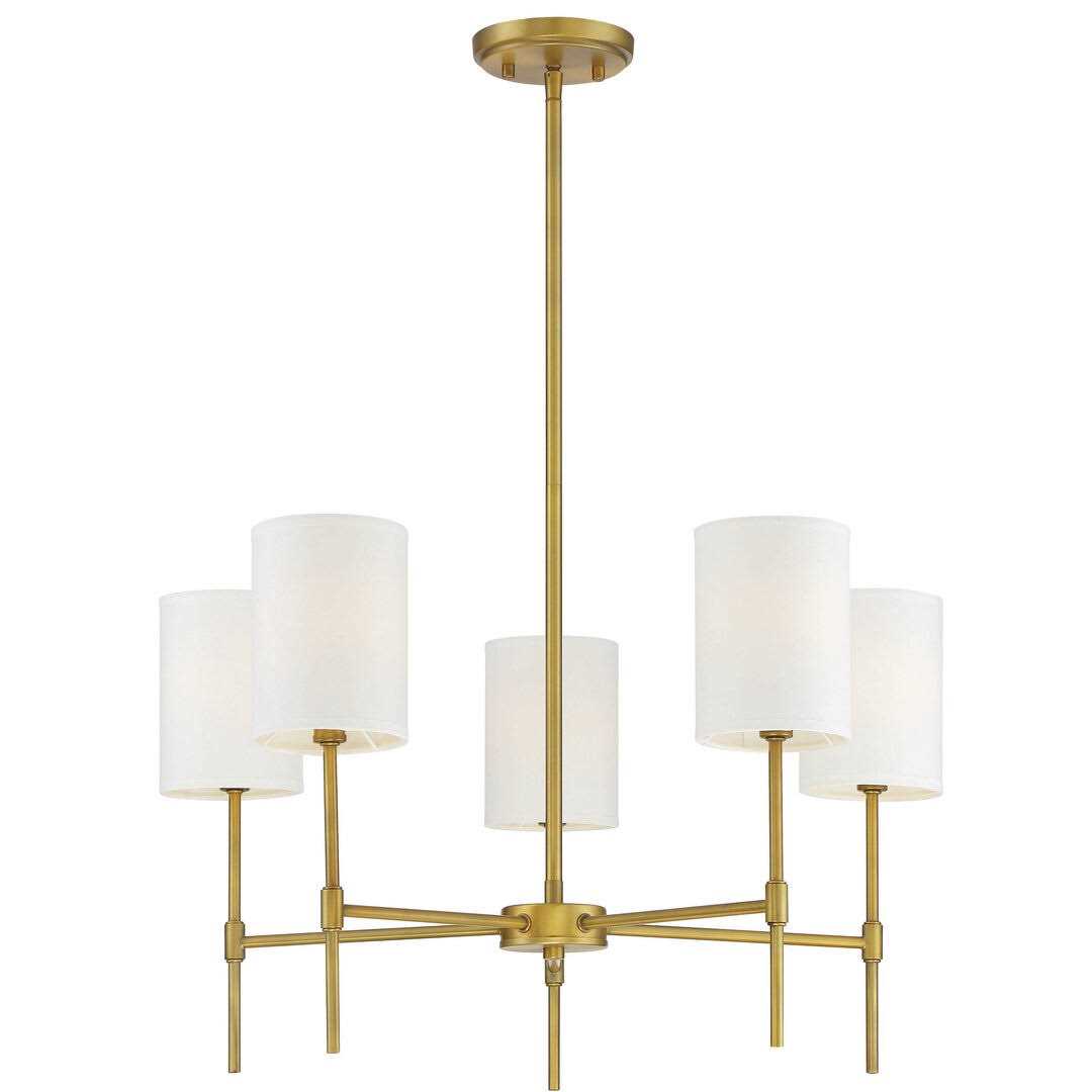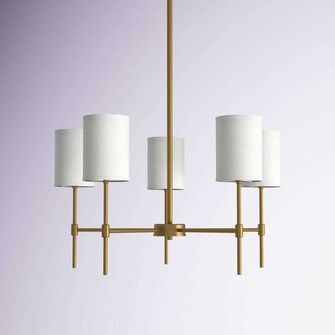 Etta Avenue This 5-light chandelier features a wallchiere-inspired design that layers on modern glam style in your living room or over your dining room table. It has a classic metal frame in a matte black or natural brass finish, with arms extending out from the centre for a linear structure. Each fixture holds a 60W bulb (sold separately) that’s surrounded by a thin, white fabric drum shade. This candelabra chandelier hangs from a height-adjustable downrod and a canopy that’s compatible with sloped ceilings. It’s also compatible with dimmer switches, so you’re able to control the amount of ambient light in your room.