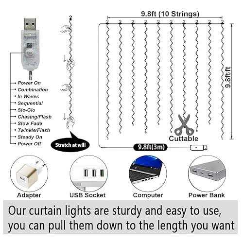 【Transform Any Space】: With 300 individual LEDs and 8 different flash modes, these fairy lights are perfect for creating a magical atmosphere in any room or outdoor space. 【Easy to Use】: Simply plug in with a USB charger or power bank and start enjoying the curtain lights anywhere you love. Plus, the 9.8ft lead wire and 10 hooks make it easy to hang them in any special place you desire. 【Versatile】: Waterproof (IP44) and perfect for weddings, parties, backdrops, home decor, window decor, wall decor, and more. Let your imagination run wild and create a fairytale world with these beautiful fairy lights. 【Safe and Durable】: Operated with 5V LOW VOLTAGE, these lights are very sturdy and safe to touch. Plus, they’re waterproof and perfect for indoor and outdoor decorations. 【Timer Remote】: Control the lights with the wireless remote and choose from 8 different flash modes, including combination, in waves, sequential, slogs, chasing/ flash, slow fade, twinkle/ flash, and steady on. Plus, activate the timer to automatically turn the lights on for 6 hours and off for 18 hours every 24 hours. Indoor and outdoor curtain light /b br 9.8ft x 9.8ft curtain waterfall light with remote control, can be timed 300 LEDs 8 lighting modes, adjustable brightness, suitable for backyard, house decoration, living room, bedroom, holiday, Christmas, wedding, etc. (warm white) br Brand: /b Eueasy br Power supply type: /b USB power supply br Number of LEDs: /b 300 br Color: /b warm white br Package includes: /b 1 set of curtain lights (including USB power supply port), 1 remote control (including G2025 button cell), user manual br Package size: /b 15×12×0.75 inch br Diameter size: /b 9.8 × 9.8 feet br Output: /b 5 volts br Operating wattage: /b 6 watts br Occasion: /b House decoration, wedding, Christmas, holiday, backyard, anniversary, outdoor recreation, party
