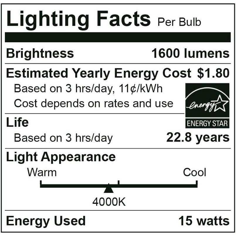 Euri Lighting’s 15 Watt LED A19 Bulb is the LED replacement for a 100 Watt incandescent bulb and is perfect for illuminating any room with cost saving, energy efficient white lighting for up to 25,000 hours. In addition to long-lasting performance, this LED A19 bulb uses just 9 watts of energy to produce a lumen output of 1600 lumens. It also features a 210° beam angle, 80 CRI, and 0.7 power factor. This bulb is ideal for use in table lamps, desk lamps, ceiling fans, pendants, sconces, and many other residential or commercial lighting applications. Available color temperatures include: 2700K Warm White, 3000K Soft White, 4000K Bright White, and 5000K Cool White. This bulb is rated for fully enclosed fixtures.