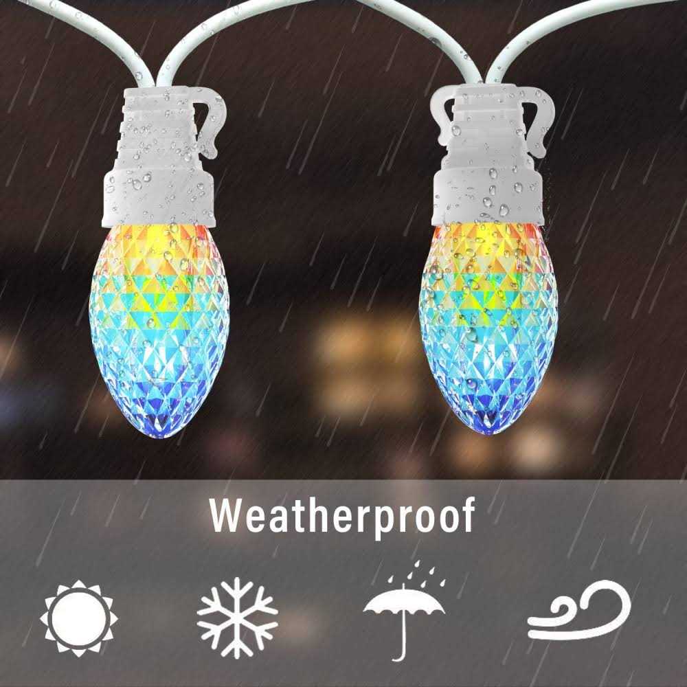 【200% brighter than others】Our C9 Christmas Light have 6 wicks per bulb, red light flashes slowly, blue and green light flashes alternately. As a result, our color-changing LED Christmas String lights are brighter than traditional incandescent strings, evoking a wonderful and welcoming atmosphere. 【Connect up to 3 Sets】 Connecting multiple sets has never been easier, with the Eva’s Light plug and play end connector, you can chain up to 3 sets of C9 Multi-Color Fairy Lights. 【Waterproof and Eco-friendly】Our Christmas lights C9 is waterproof, windproof and snow proof, which makes them suitable for indoor or outdoor use. The bulbs around the lights are safe and reliable, keeping low temperature even after many hours of use. 【Shatterproof】C9 outdoor string lights are made of plastic, the bulb wall is as thick as two ordinary Christmas bulbs, especially durable. They will not break when dropped or stepped on. If one bulb goes out, the rest will remain lit. 【Christmas Decorations】Beautiful decorations for Christmas party, can be used in any corner like indoor bedroom, window, fireplaces, doors, table tops, living room or outdoor garden, courtyard, terraces, patio, frames, stair rails, trees, lawn and so on, creating festival atmosphere. p RGB C9 Christmas Lights Outdoor /b – ol li C9 multi-color LED fiery lights /li li Create a stunning color-changing fire glow effect /li li Connect up to 3 sets end-to-end /li /ol p – i Product Specification /i /b – ul li Power: Class Il Adapter 5V, 2A. /li li 20 C9 LED bulbs /li li Operation: Indoor/ Outdoor /li li Operating Temperature: -15°F to 90°F (-26°C to 32°C) /li li Light String Length: 23Ft /li /ul