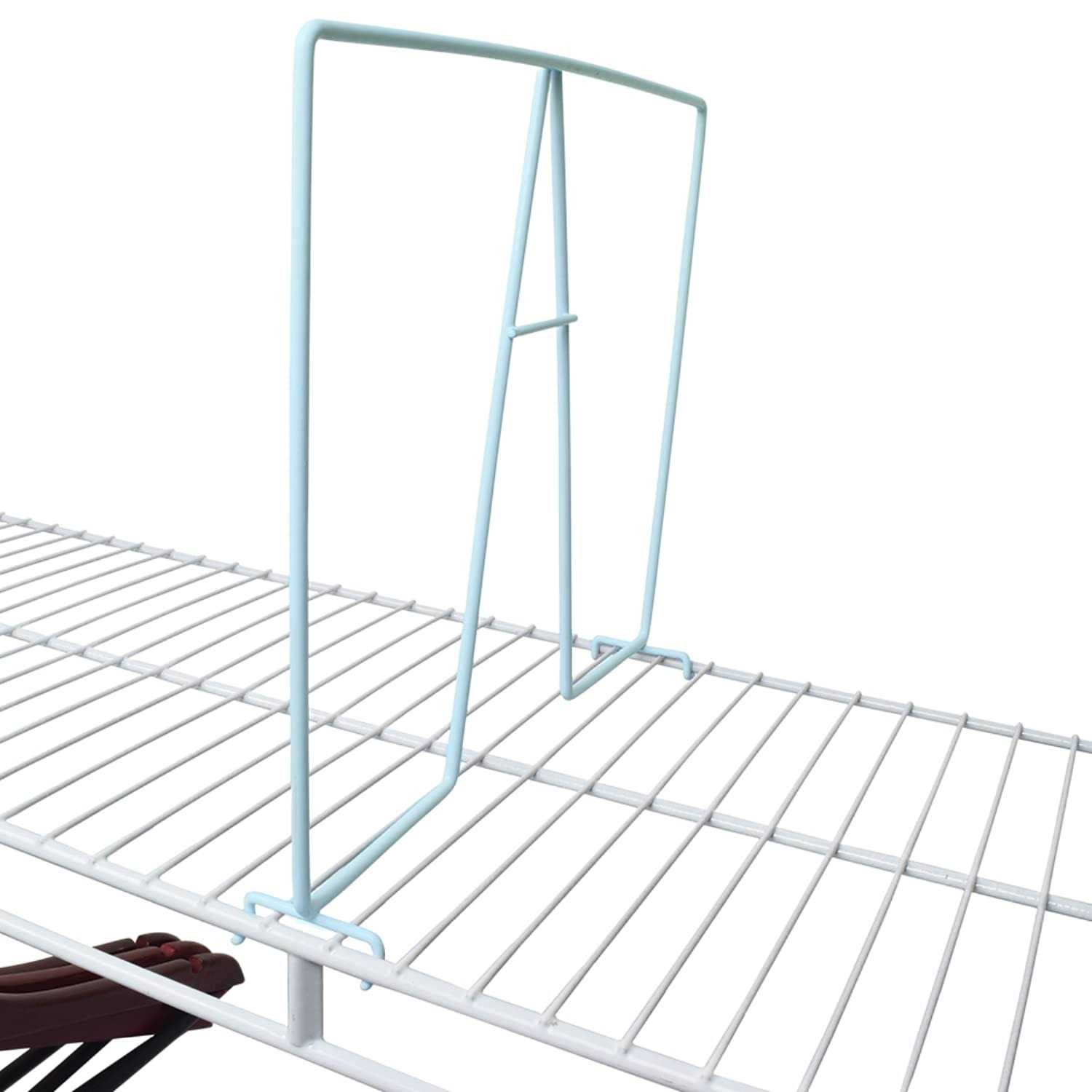 It allows you to stack any stackable item neatly. Use as room for separating clothes, shoes, kids toys, bath towels, bags, office supplies. kitchen supplies , tools, shoe organizer, books and more. Space Saving Design: For closet shelves, when you can’t move outward, move upward! These wire shelf dividers are a great way to utilize vertical space. Support your stacked items like your tshirts, hoodie, jeans neatly. Keep your closet organized with these dividers that make storage and organization simple. Versatile Use Closet Dividers: This closet shelf organizer offers a versatile storage solution for all your needs from a baby closet organizer, handbags, pants, linens for bed, yoga pants and other clothes, shoes and boot storage. Easily Clips On: This closet storage organizer simply clicks into your existing wire shelving. Easy moving when reorganizing your house. Sturdy shoe storage. The dividers each measuring 12.25 Inches Wide x 10.75 Inches High with prongs 2 Inches Deep. This set of wire shelf dividers will help you get rid of clutter and keep your closets organized and clean. Once you use these dividers you will wonder how you ever got along without them! New and improved design offers more stability. You will be able to stack linens higher than ever before without them toppling over or getting intertwined with other clothing. Perfect for keeping stacks of t-shirts, towels, sweaters, accessories, and more! Spread them out as far or as close as you would like. Each divider measures approximately 10.75 Inches height by 12 Inches wide with a bracket width of 2 Inches. Specially designed to simply clip into existing wire shelving systems. Made of plastic coated steel frames that will not rust. Use caution when mounting to wire shelving unit.