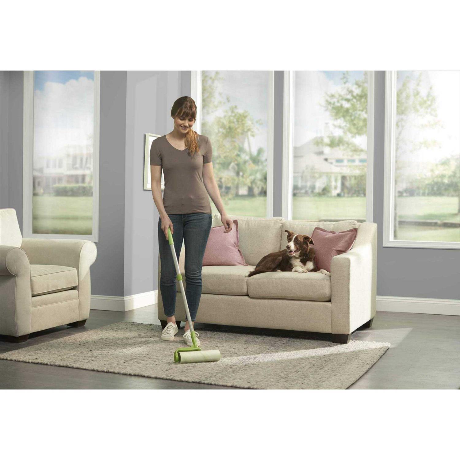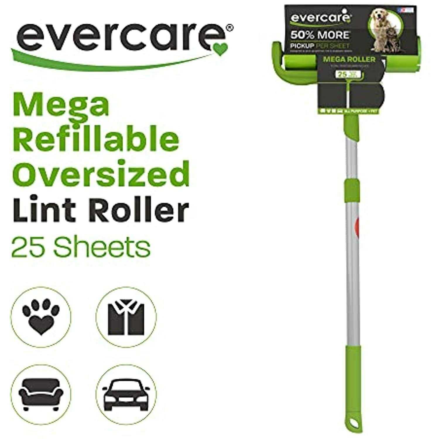 Remove tough pet hair and debris from clothing, furniture and more 10″ Wide roller surface coverage 25 easy peel sheets Forgo the Vacuum and roll the pet hair and debris away. Evercare Pet Mega Extreme Stick Surface Roller features a 10-inch wide roller to easily remove pet hair and debris from bedding, stairs, rugs and more. Save time and skip the vacuum! Surface roller features reusable outer cover, and adjustable 36-inch handle with 25 sheets that are green and white alternating color layers for easier peeling. Additional refills available (model 617136).