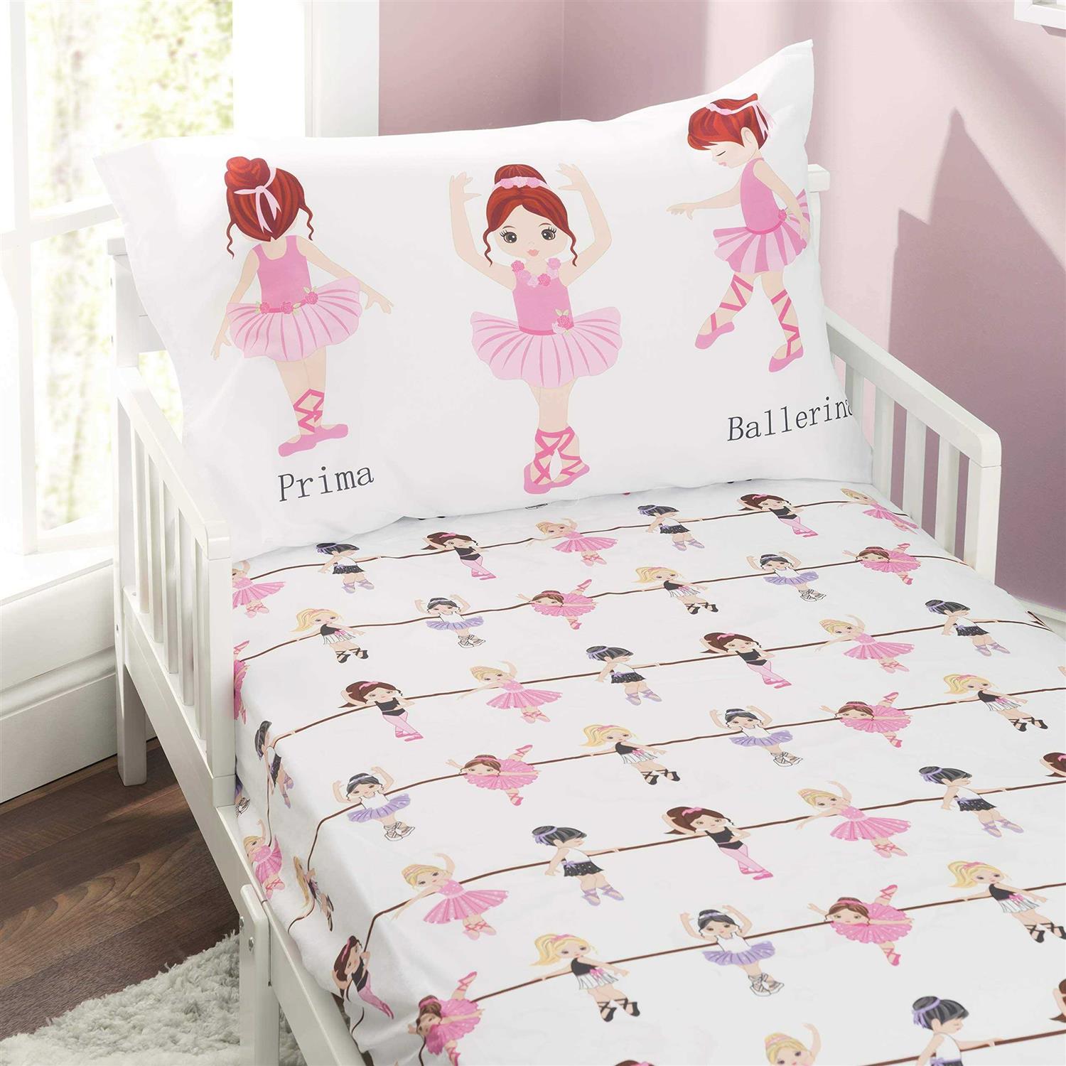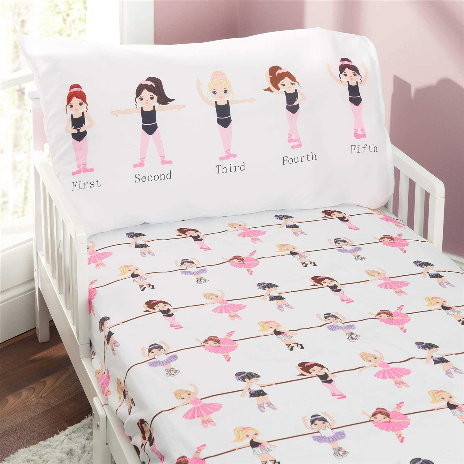 Inspire the budding ballerina in your life with the adorable Everyday Kids Toddler Fitted Sheet Pillowcase Set in Born to Dance Ballerina. This girls toddler sheets set shows girls in glittery skirts and leotards doing several ballet poses. The pillowcase shows different labeled ballet positions, making it both cute and interactive. The lovely illustrations on this ballerina toddler sheets set helps keep your daughters mind engaged as she lies in bed. A few poses before bed or after waking up gets small girls into the habit of being active, preparing them for exercise as they get older.