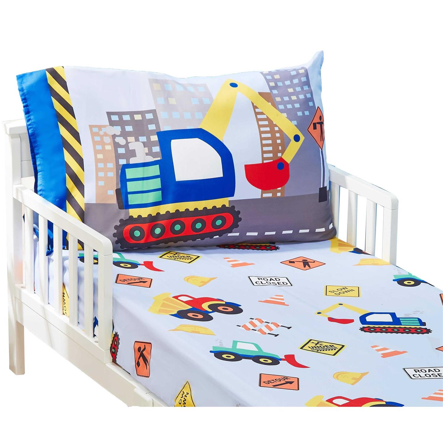 Toddler Fitted Sheet and Pillowcase Set -Under Construction- Soft Breathable Microfiber Toddler Sheet Set Color Under Construction EVERYDAY KIDS Material Polyester, Polyester Blend Number of Pieces 2 Product Care Instructions Machine Wash SOFT, COZY AND COLORFUL – The day your little one is ready to move out of his or her crib is a major milestone. The Everyday Kids 2 Piece toddler sheets set can help you make this a moment to celebrate and ease the transition. With many color and pattern options, there’s sure to be a design that your kid loves. HIGH QUALITY & EASY CARE – Each set is made of 100% soft brushed microfiber polyester. This high-quality material is breathable and fade resistant. It creates a comforting and calming sleep environment to help kids get the rest they need. To preserve the bold colors and playful designs, it’s best to machine wash the set in a gentle cycle, in cold water and with similar colors. You can tumble dry