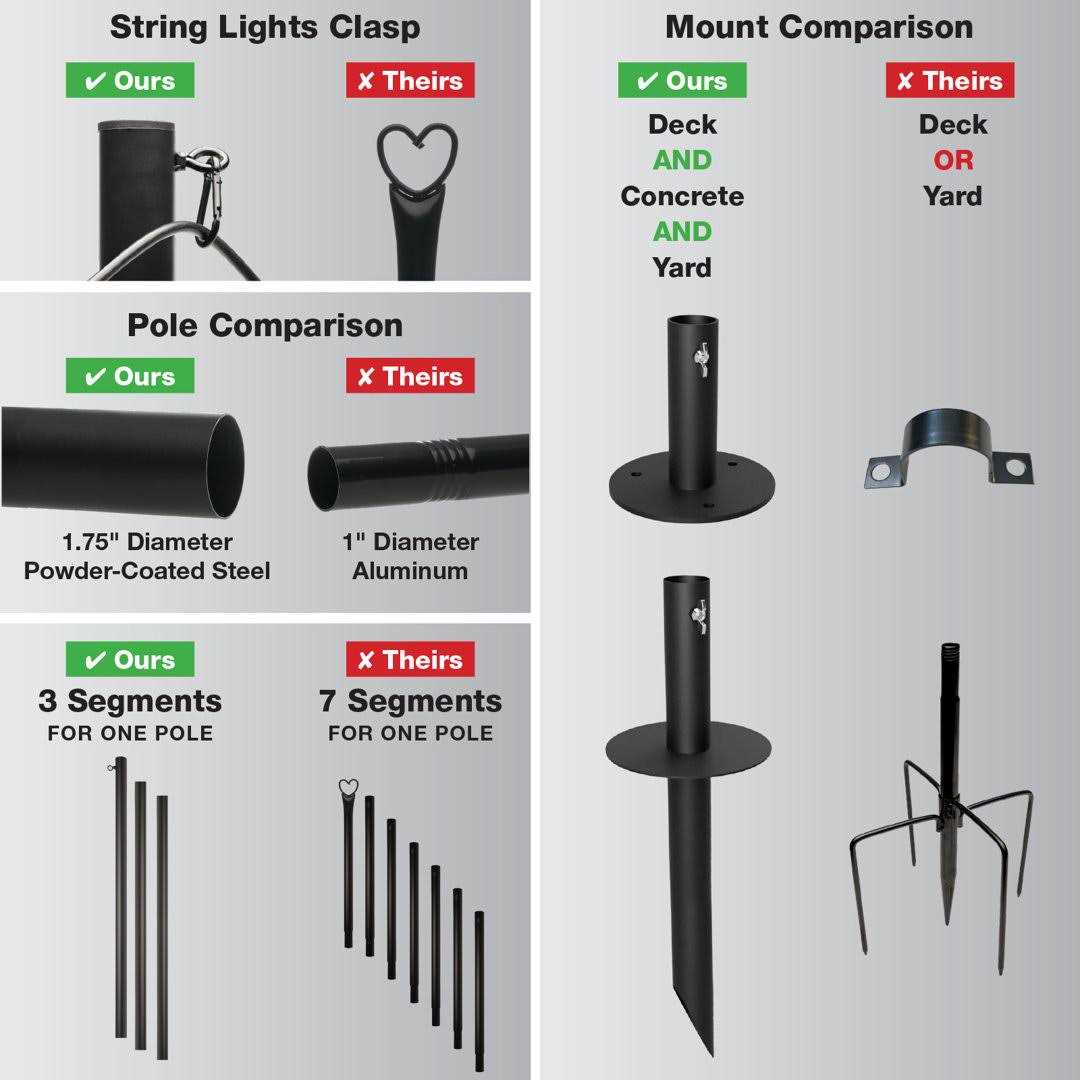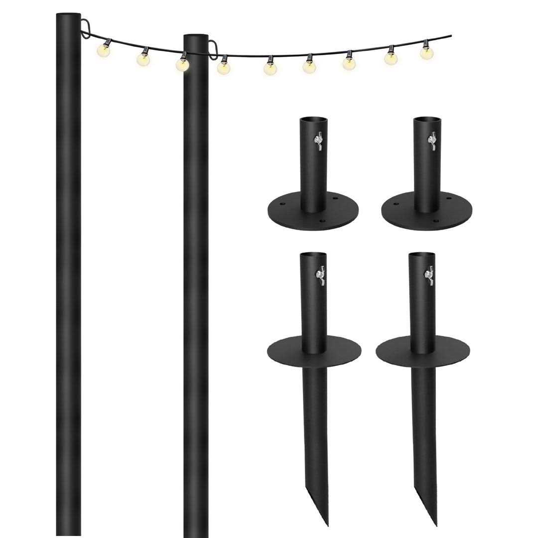 Excello Global Products The string light poles are made from steel with a durable black powder-coat finish that adds a professional and elegant look to your outdoor space. Enhance the ambiance of your patio. Each pole extends to 10 feet tall and includes clips to keep your favourite string lights hanging securely above. Two types of bases are included for each pole; a flat base with 3 pre-drilled screw holes for hard surfaces such as concrete or wood, and a 10-inch yard stake base for softer surfaces such as grass or dirt. Bring the professional quality of commercial-grade lighting poles to your backyard or business year-round, without the fuss of flimsy poles or messy four-pronged stakes.