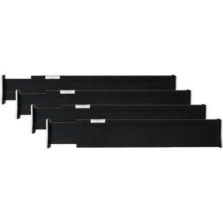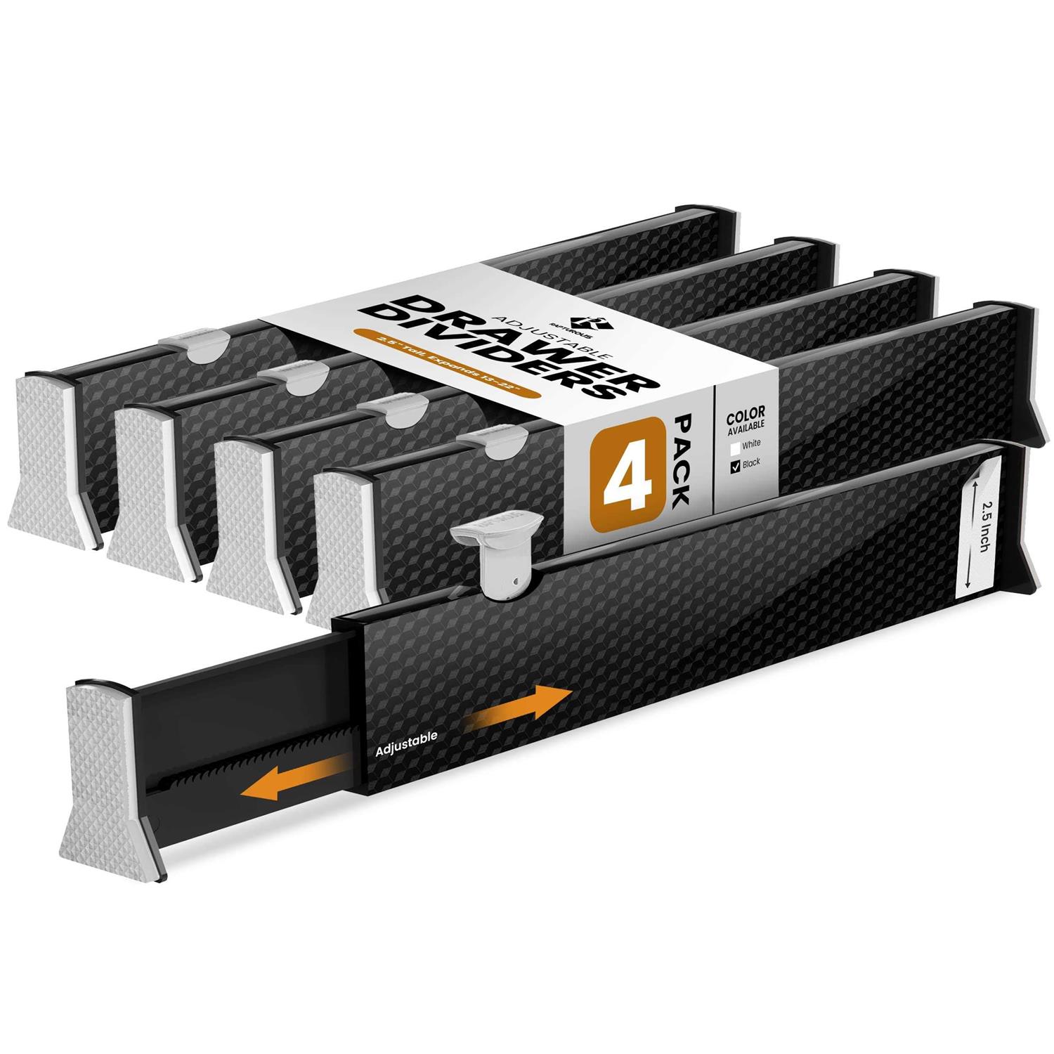 Your Drawers Will Never Be Messy Again! RAPTUROUS presents you with these premium drawer dividers that have been specially designed to keep your drawers organized at all times! Each pack includes 4 Black drawer organizers that you can install in any drawer in your house and use as: Dresser drawer dividers Sock and underwear drawer organizers Baby clothes dividers Bathroom drawer organizers Makeup drawer organizers Utensil, silverware and cutlery drawer organizers Desk drawer organizers Toolbox drawer organizers Bookcase and shelf dividers Drawer Dividers That Will Undoubtedly Fit Your Drawers! The best feature of this dresser drawer organizers is their expandable and adjustable design that allows you to install them in ANY drawer! More specifically, the height of these kitchen drawer organizer is 2.5 inches, while their length can be adjusted between inches. That s convenient, right? Smart Design That Will Keep Your Drawers Intact! The edges of our 4 drawer storage organizers are covered with Eva foam sponge, so they are soft and nonslip. In this way, the inner walls of your drawers won t get scratched or damaged, and the clothing dividers will stay securely in place. This Is An Investment You Won t Regret! And why would you? Made with heavy duty plastic and premium quality Eva foam, these drawer dividers are built to last a lifetime! So what are you waiting for? Place an order and deal with your drawer organization one last time! Scroll Up And Click Add to Cart NOW!
