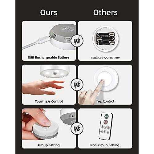 【2 Ways for Group Control】 EZVALO Puck lights with remote can be assigned into 2 groups for separate control. By a simple hand-sweep (within 1.2 inches) or using the remote control, all the led puck lights in the same group can be dimmed and turned On/Off in unison, no need to touch each closet light individually. 【Rechargeble and Energy-Saving】With a built-in 2000mAh lithium battery instead of replaced AAA batteries, the rechargeable puck light lasts 19 hours on the Max Brightness. Charge 3 puck lights at the same time with 3 in 1 USB cable, super convenient and saving up to 80 AA dry cell batteries per year per light. 【Easy to Install & Reposition】 Method 1: Each wireless puck light comes with magnetism, just attach the lights to iron products. Method 2: Equipped with a sticker mounting disk, install in 3 seconds at any where you want. Easily take the magnetic puck light off when you need a dash of light in the darkness and reposition. 【Light Gathering and Dimmable】These under cabinet lights provides a natural daylight color at 5000K and 40Lumen, focusing on the object and less dispersing to the background, making your food, dishes and cabinet a fresh look. When hands are covered with water or juice, dimming the cabinet lighting from 10 to 100% by hovering hand under the light without touch. 【Broad Application】 Size: 1 .2 x 3.3 x 3.3 inch, compact and handheld, it is suitable for all kitchen cabinets size. These puck lights battery operated are ideal as closet lights, under cabinet lights,wine cabinet lights, display lights, office lights, under counter lights for kitchen.