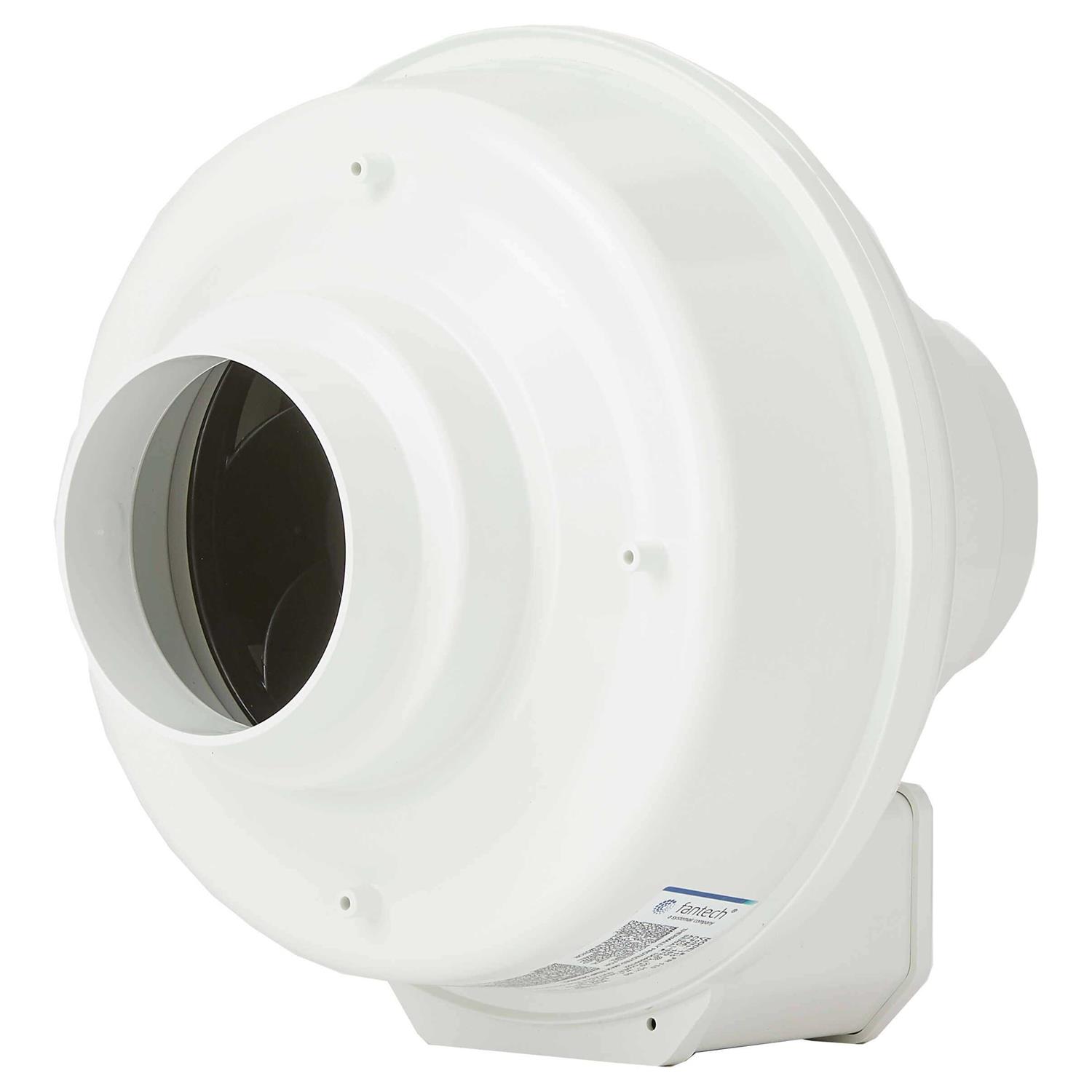 Fantech Centrifugal in-line fan features a vibration-welded seam that ensures leak-proof housing. It mounts in any angle at any point along the ductwork and straight-through airflow design for quick and easy installation. This fan with Class B insulation supports 100% speed control through varying the voltage by using a solid-state or transformer type control. Fan featuring FC type mounting clamps allow removing the fan quickly and easily for services. It delivers airflow up to 151 CFM. Thermoplastic housing ensures greater protection to fan and motor. This 1833 RPM fan has voltage rating of 115-Volts current rating of 0.17-Amp and power rating of 19.5-Watts at 60-Hz. It operates in air stream temperatures up to 140 deg F. It measures 10-9/16-Inch x 10-Inch. It uses 4-Inch ducts. It has a adhesive caulk that joins and seals the housing. It is perfect for multiple point exhaust residential and commercial applications crawl space venting or make-up air supply. It serves as booster fans to move air from one room or area to another. In-line fan is HVI certified and cULus listed.
