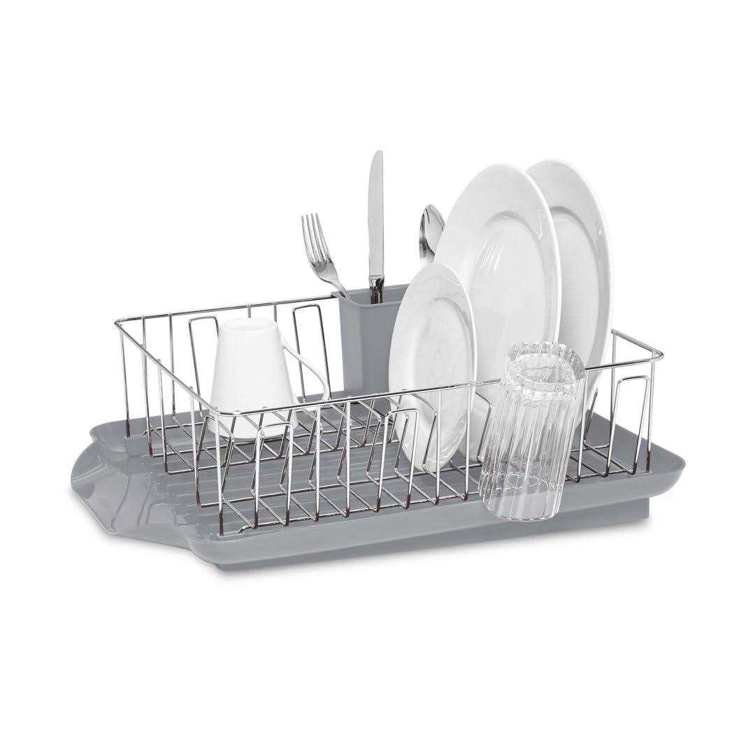 Never have the issue of running out of space when washing dishes, featuring a large basket to dry a variety dinnerware, cookware, and flatware. The large, high capacity basket is constructed of satin powder-coated wires that are rust resistant for long lasting use. The wires are heavy duty and will securely hold dinnerware and prevent scratches. The caddy features 3 compartments for easily organizing and separating flatware and other kitchen tools. Its also removable for easy unloading. The self-draining board is removable for multi-purpose use; perfect for drying large pots, pan and roasters. The bottom features a soft, non-slip feet that ensure stability and protect countertops from scratches. The basket measures approximately 16-inch by 14-inch and the draining mat measures approximately 21-inch by 15-inch.