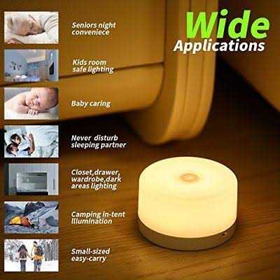 Touch Activated—Much convenience in dark Night searching the light,all you need Is one slight touch on top to turn ON/OFF the light. ne slight touch on top to turn ON/OFF the light.2. Stepless Dimmer & Memorising—You can adjust the brightness you need by a little click,next time when you turn on the lightness level will be shown as you set ,if you want to dim just hold the press until lights turned.3. Rechargeable and Wireless—Power by 500 mAh rechargeable batteries,maintain long endurance for many days,anytime you can recharged it with our high quality micro usb line,light will turn red, about 30mins red light disappears and the charge is complete.4. Widely used in many situations lights to choose—No need to fumble around in the dark ,perfect to be your bedsides lamp,especially for baby room(wireless and quite),closets, under cabinets, pantries, storage rooms etc, atmosphere decorative mood light,warm and puck two choices for you.5.