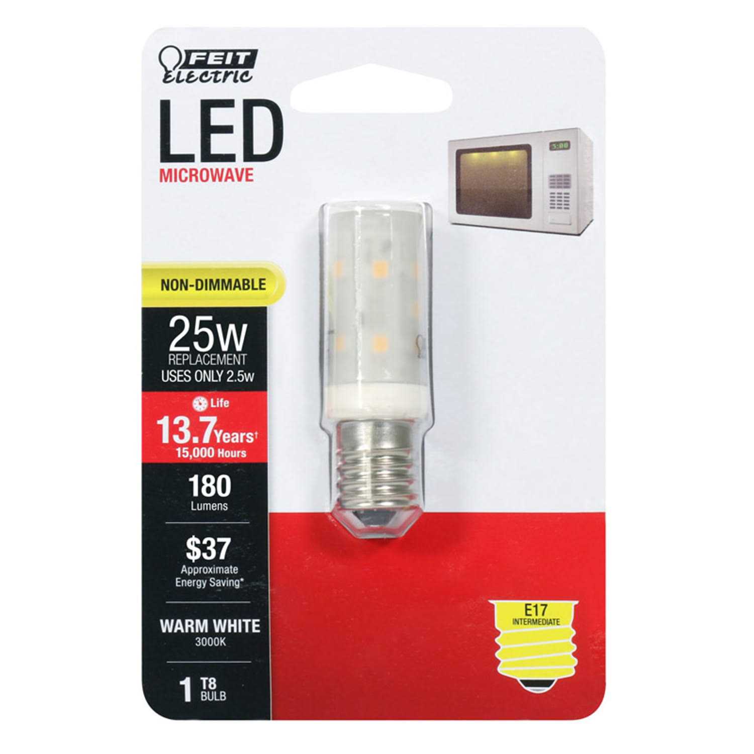Offer instant brightness to your indoor and enclosed outdoor areas with the Feit electric LED bulb. With its energy-saving technology, the bulb is ideal to install in a microwave. The microwave LED bulb has plug-in technology which uses screws to make installation easy. The warm white LED bulb produces a light output of 180 lumens and uses 2.5 watts of electricity.