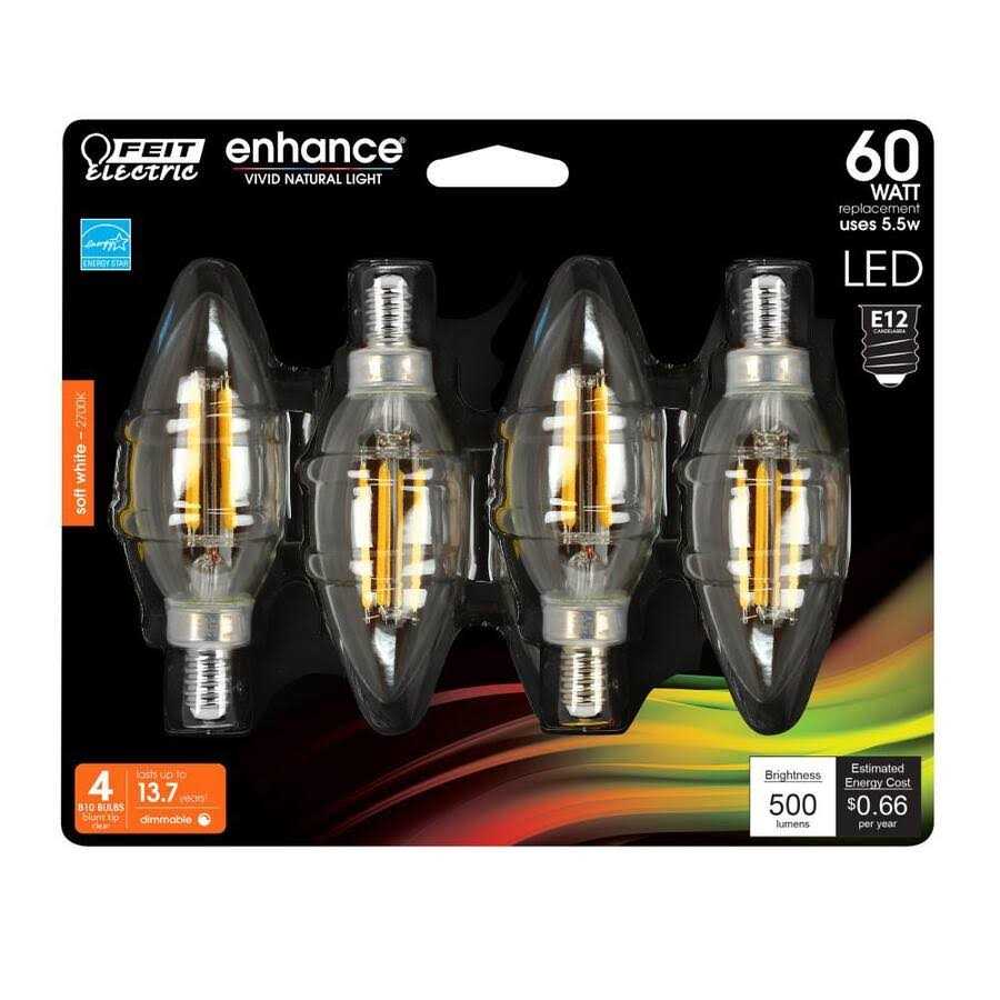 Feit Electric filament torpedo B10 LED bulbs let you enjoy all the benefits of advanced LED energy-saving technology with a high-CRI decorative bulb. The BPCTC100927CAFIL/2 emits 1000 Lumens of light while using just 10 Watts (100-Watt equivalent) of electricity, and estimated energy costs only $1.20 per year. It’s 2700K Soft White glow perfectly sets a relaxing, cozy atmosphere ideal for spaces that need a light source without the worry of a harsh glare. Use this bulb in any fixture with a Candelabra E12 base socket such as chandeliers, wall sconces, coach lanterns and more. Marry the feel and look of classic bulbs with the advantage of LED technology. It’s stylish traditional design with exposed filament encased in clear glass instantly livens up the decor of any room all while saving up to 90% more energy than standard bulbs and lasting up to 15,000 hours. A 90+ CRI brings out true colors making them look vibrant and skin tones look natural. This bulb is fully dimmable giving you the ability to dim down when watching movies, having a romantic dinner or up when you need to focus on other tasks such as homework. Create a long-lasting, energy-efficient beautiful glow that brightens your home and commercial space.