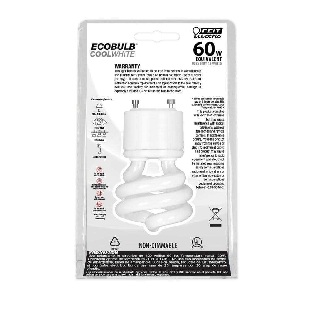 It produces a similar light output of 900-Lumen, uses 13-Watt of electricity and up to 78% less energy than a standard incandescent light bulb. This compact fluorescent light is ideal for ceiling fans, chandeliers, table lamps or wall sconces. Feit Electric CFL bulbs have a relatively cool running performance, an average life of 10,000-hour/ 9.1-year and are RoHS / FCC compliant. Choose a dependable, general purpose lighting bulb for residential or commercial applications.
