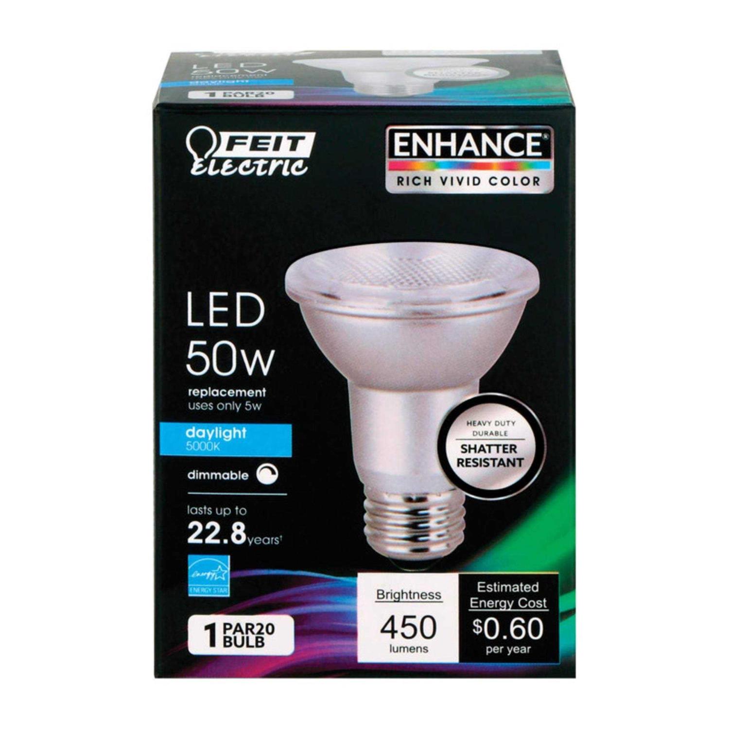 Enjoy all the benefits of advanced LED energy-saving technology with the Feit Electric PAR20DM/950CA50W dimmable Enhance LED Light Bulb. This bulb meets CEC title 20 light bulb standards, produces 5000K daylight and will replace a50-watt equivalent incandescent bulb. Enhance LEDs make colors appear vibrant as they really are. It produces a light output of 450 lumens, uses5watts of electricity and up to 90% less energy than a standard incandescent light bulb. Get instant on to full brightness with relatively cool running performance.