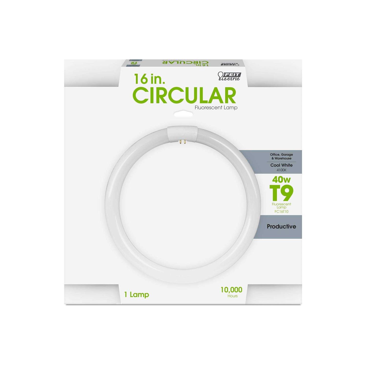 Enjoy all the benefits of advanced LED energy-saving technology with the Feit Electric 16-inch T9 Fluorescent Circular Light Bulb. This 2950-lumen 4100K Cool White non-dimmable light uses 40 watts of electricity and is ideal for ceiling fan and fixture applications. Our Compact FC16T10/CW Fluorescent bulbs have a relatively cool running performance, an average life of 12,000 hours/11 years and are FCC compliant. Replace older, lumen depreciated light bulbs with newer fluorescent light bulbs to maintain full brightness. They have an estimated energy cost of only $4.82 per year.