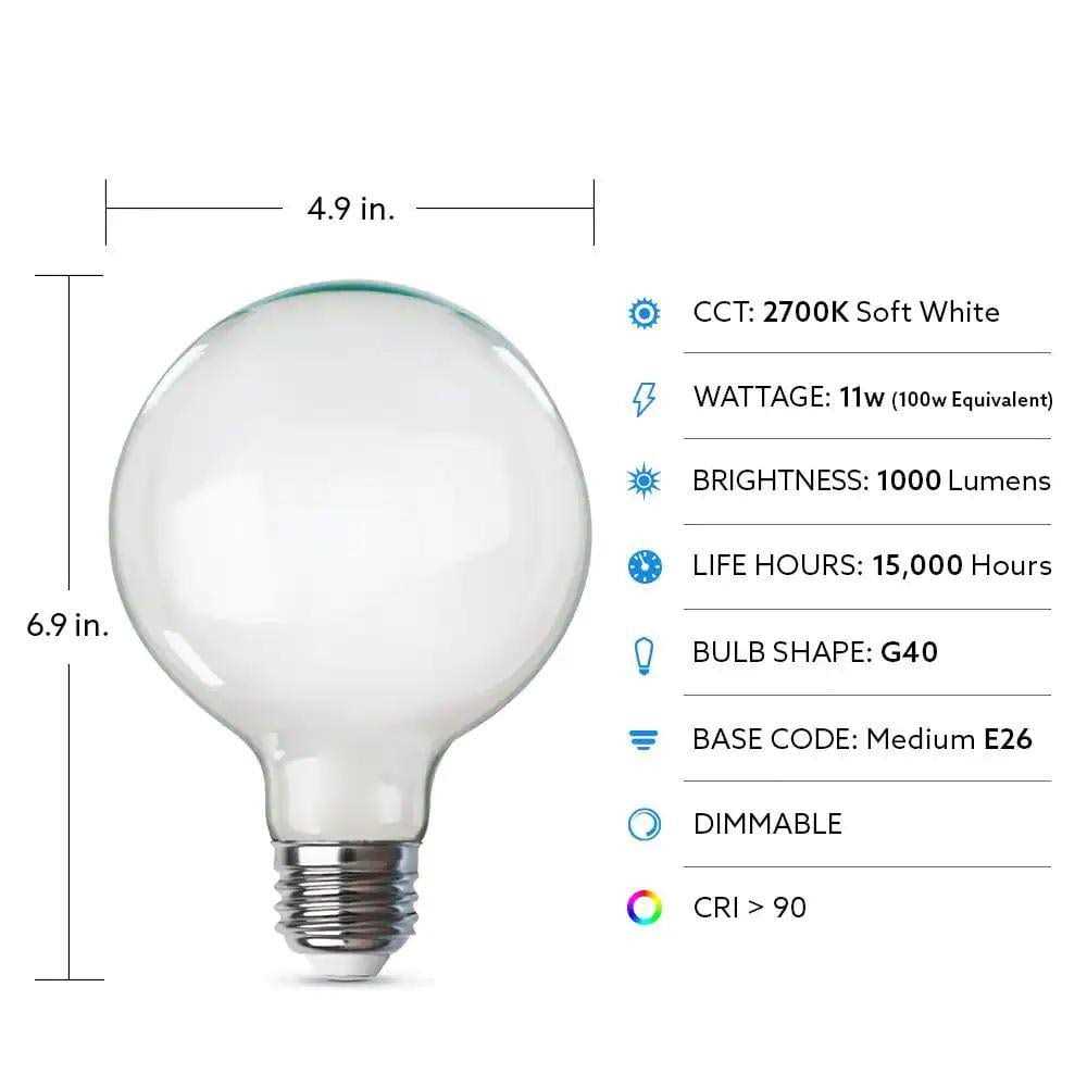Combine the timeless beauty of classic style with the benefits of modern LED technology with Feit Electric soft white dimmable 100-Watt Edison Vintage-Style G40 globe LED light bulbs. This vintage-style, decorative light bulb is designed with an intricate straight filament that emits warm 2700K light that evokes a nostalgic ambiance when placed in light fixtures where the light bulb is exposed, such as dining room pendants, or when it is used as a statement piece on its own. Place them above a kitchen dining table, hang above a bar, give a bedroom a cozy vibe, immerse your guests in a living room that feels welcoming, or use them anywhere you want to create a serene atmosphere. Your options are endless! Its 1000-Lumen output creates a golden glow through a white glass housing for a relaxing atmosphere that transforms any kitchen, living room, bedroom, restaurant, or bar into a retro locale. These vintage style bulbs fit into any light fixture that is compatible with a standard, medium E26 base. Its filament is embedded with LEDs for modern reliability and energy savings. With full dimming capabilities, this Globe-shaped bulb allows you to dim up or down for customized vintage lighting you can enjoy across your spaces. Choose Feit Electric decorative LED Edison light bulbs for residential or commercial applications.