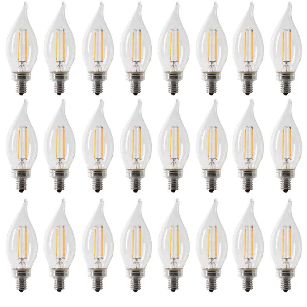 Feit Electric filament flame tip BA10 LED bulbs let you enjoy all the benefits of advanced LED energy-saving technology with a high-CRI decorative bulb. The BPCFC60927CAFIL/4 emits 500 Lumens of light while using just 5.5 Watts (60-Watt equivalent) of electricity, and estimated energy costs only $0.66 per year. It’s 2700K Soft White glow perfectly sets a relaxing, cozy atmosphere ideal for spaces that need a light source without the worry of a harsh glare. Use this bulb in any fixture with a Candelabra E12 base socket such as chandeliers, wall sconces, coach lanterns and more. Marry the feel and look of classic bulbs with the advantage of LED technology. It’s stylish traditional design with exposed filament encased in clear glass instantly livens up the decor of any room all while saving up to 90.8% more energy than standard bulbs and lasting up to 15,000 hours. A 90+ CRI brings out true colors making them look vibrant and skin tones look natural. This bulb is fully dimmable giving you the ability to dim down when watching movies, having a romantic dinner or up when you need to focus on other tasks such as homework. Create a long-lasting, energy-efficient beautiful glow that brightens your home and commercial space.