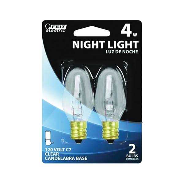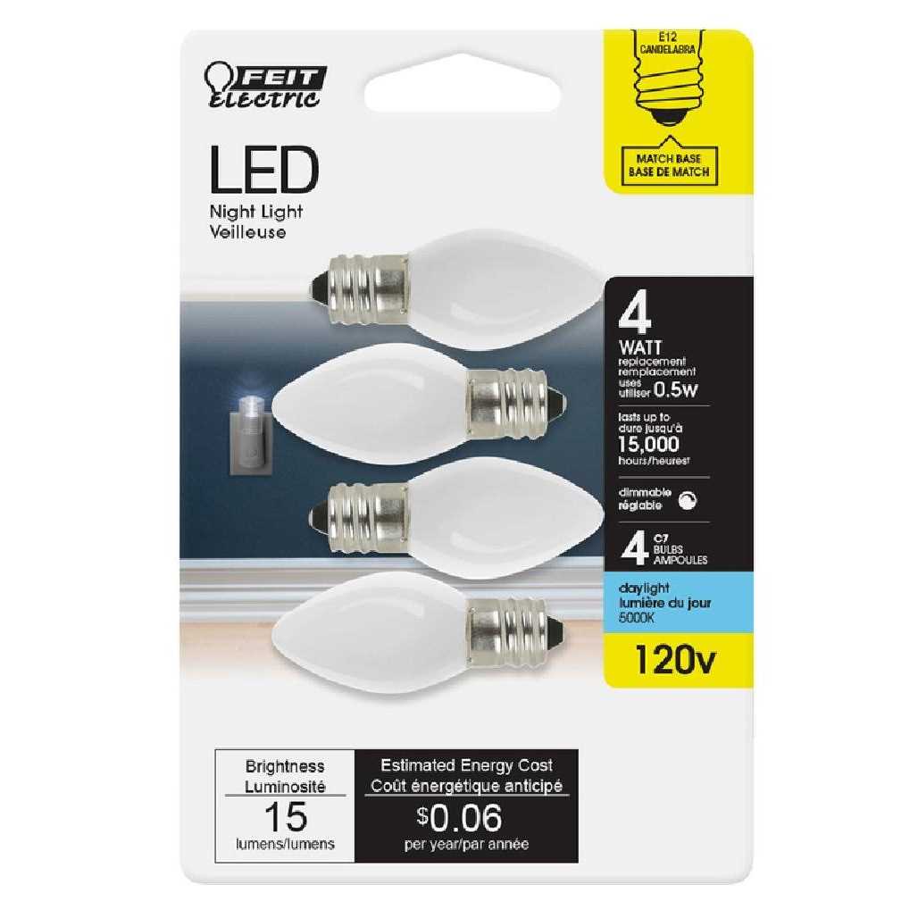 Swap out your old incandescent night light bulbs with new energy efficient LEDs by Feit Electric. These C7 night light replacement bulbs produce 15 Lumens of 5000 K daylight glow using only 0.35 W – up to 91% less than equivalent incandescent. LED technology provides an average life of 15,000 hr or over 13 years. Keep your indoors safe and secure with the Feit Electric night light bulbs.