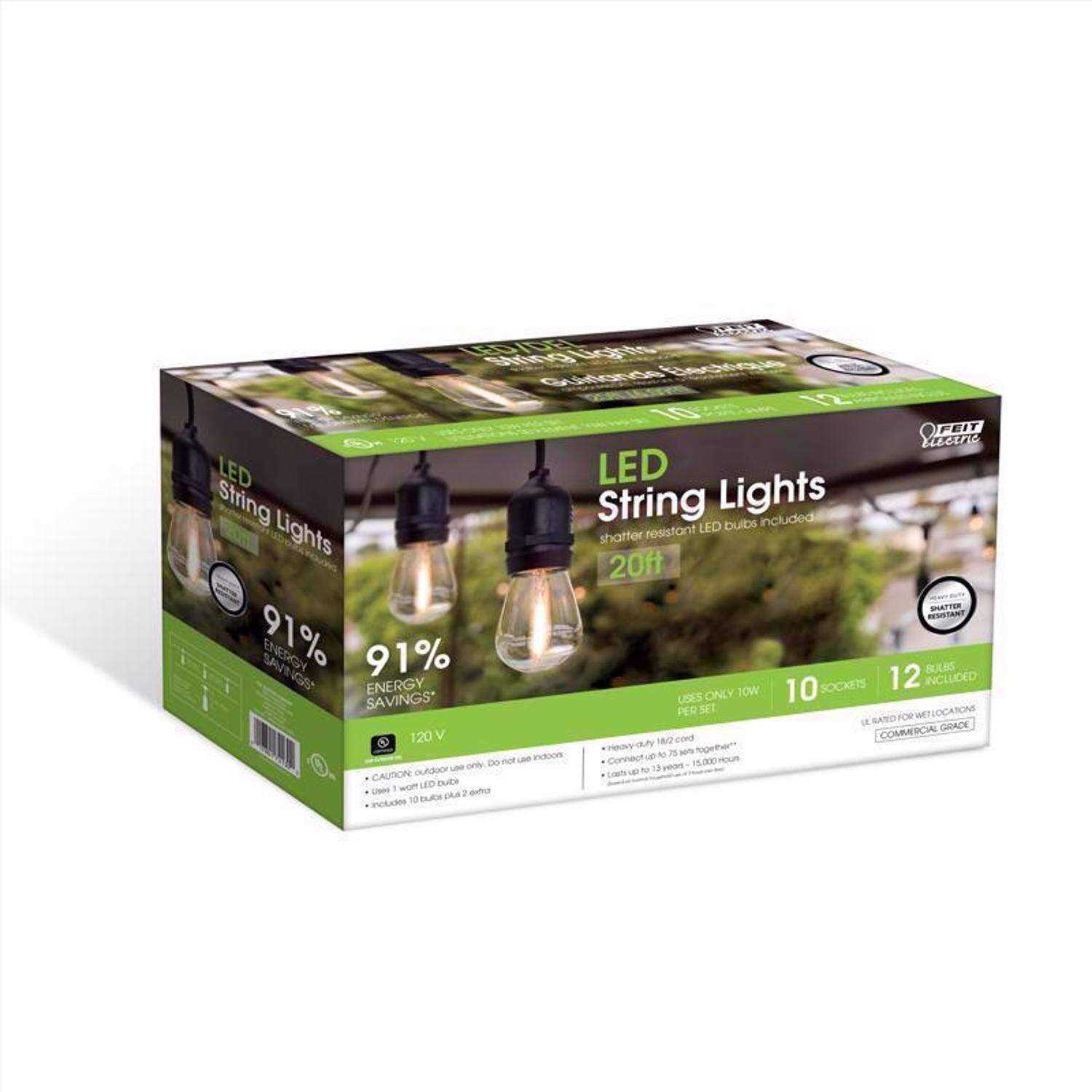 Enhance any outdoor area with the Feit Electric 72122 20 ft. The bulbs give off a warm amber glow perfect lighting for gazebos, patios, pergolas, restaurants and more. Our string lights are made with commercial-strength, heavy-duty 16/3 SJTW that withstands extreme temperatures and wet weather for year-round enjoyment. If one bulb goes out, the rest will remain lit. Decorate and illuminate your next festive celebration.
