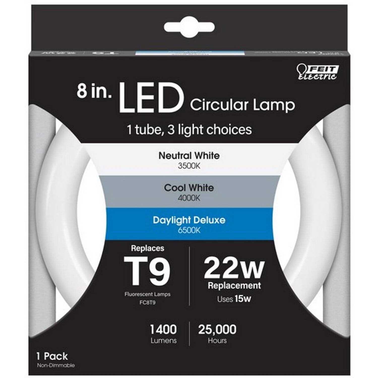 Upgrade fluorescent fixtures to the latest LED energy-saving technology with the Feit Electric 15-watt (22-Watt Equivalent) 8-Inch Circline LED Light. These non-dimmable 1400-lumen circular light tubes replace FC8T9 or T9 bulbs, ideal for ceiling fan and fixture applications. Choose between 3500K Neutral White, 4000K Cool White, or 6500K Daylight before installing to have the right light for any job. Feit Electric circline fluorescent replacement bulbs have a relatively cool running performance and use 31.8% less energy than fluorescents. Installation is easy: simply plug the new lamp into the existing ballast. No replacement or removal of the ballast is required. These lights offer instant-on, flicker-free full illumination with no warmup time. They are mercury-free and shatter-resistant for safe and easy disposal. Each high-quality bulb offers accurate color-rendering, for more vibrant, true-to-life colors. Enjoy lower maintenance costs compared to traditional fluorescent circline lights. Switch to FC8/3CCT/LED Type A LED circline lights for your space and get up to 25,000 hours of superior light. That’s 22.8 years with 3 hours of daily use. The estimated energy cost is only $1.81 per year.