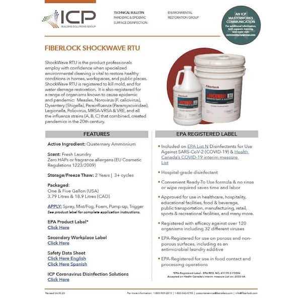 Fiberlock ShockWave Ready-to-Use or RTU is an EPA registered disinfectant, sanitizer, and cleaner capable of killing human coronavirus with 10-minute contact time. ShockWave is strong enough to be used in a hospital or medical environment and has been specifically formulated to be used on both porous and non-porous materials. ShockWave has over 130 organism kill claims including Aspergillus niger, Penicillium spinulosum, E. coli, Salmonella, HIV, Hepatitis-B, Herpes, Poliovirus, and many other pathogenic and environmental microbial organisms. EPA List N for use against COVID-19 Registered for use against Human Coronavirus, H1N1, Avian Flu Over 130 organism kill claims Registered for sewage/black water remediation Sanitizes porous and disinfects non-porous materials ShockWave is a state-of-the-art disinfection/sanitizer/cleaner designed to handle any situation a remediation professional might encounter. ShockWave has been formulated, tested, and is registered by the EPA for use on more surfaces, in more situations, and to kill more organisms than any other product. When demonstrating efficacy, ShockWave was tested successfully in the presence of a 98% organic soil load as opposed to the EPA minimum and industry norm of 5%. Although the EPA does not require extreme testing, and no other manufacturer attempts this, it is the only way to demonstrate how effective a product will be when used in actual field conditions. ShockWave is EPA Registered for use in water damage restoration, carpet sanitization, sewer backups (black water, gray water), on porous and non-porous materials, and non-food contact surfaces.