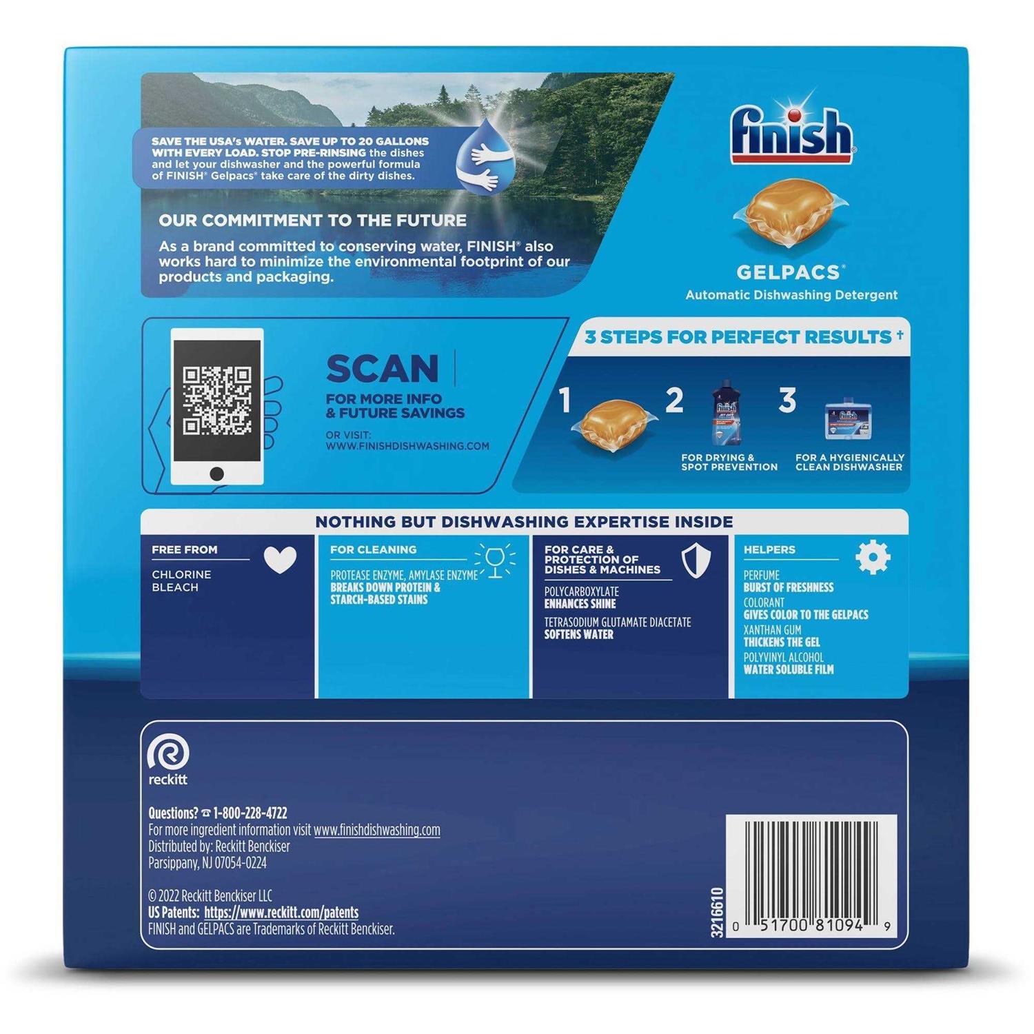 From the World’s #1 Recommended Brand, Finish All In 1 Gelpacs tackle tough messes. It has 3X concentrated cleaning power of regular Finish Gel. Our revolutionary Pre-Soakers burst into action to scrub away tough food residues like baked-on lasagna and dried-on oatmeal. Our Powerful Cleaners remove even the toughest stains and gently scrub your dishes & glasses sparkling clean. All In 1 Gelpacs are easy-to-use & pre-measured pods with a refreshing orange scent that are safe for septic systems. More Dishwasher Brands Recommend Finish products Worldwide than any other brand. Recommendations as part of Co-marketing Agreements.